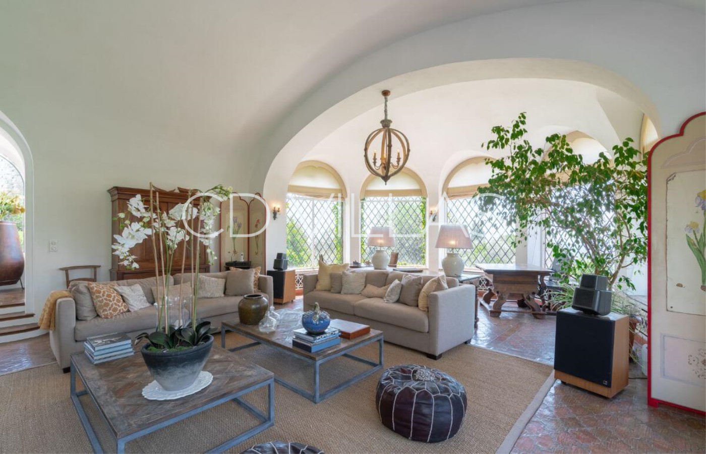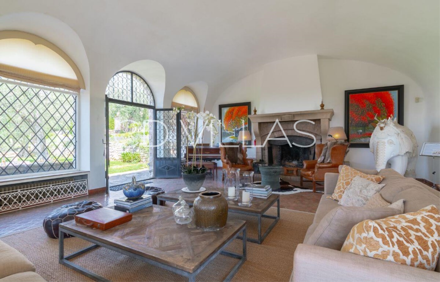 Wohnzimmer - Majestic vaulted living room with comfy seating, open fireplace and French windows opening onto the terrace. mit majestätisches gewölbtes Decke, bequemen sofas, offenem Kamin und französischen Fenstern, die auf die Terrasse führen.