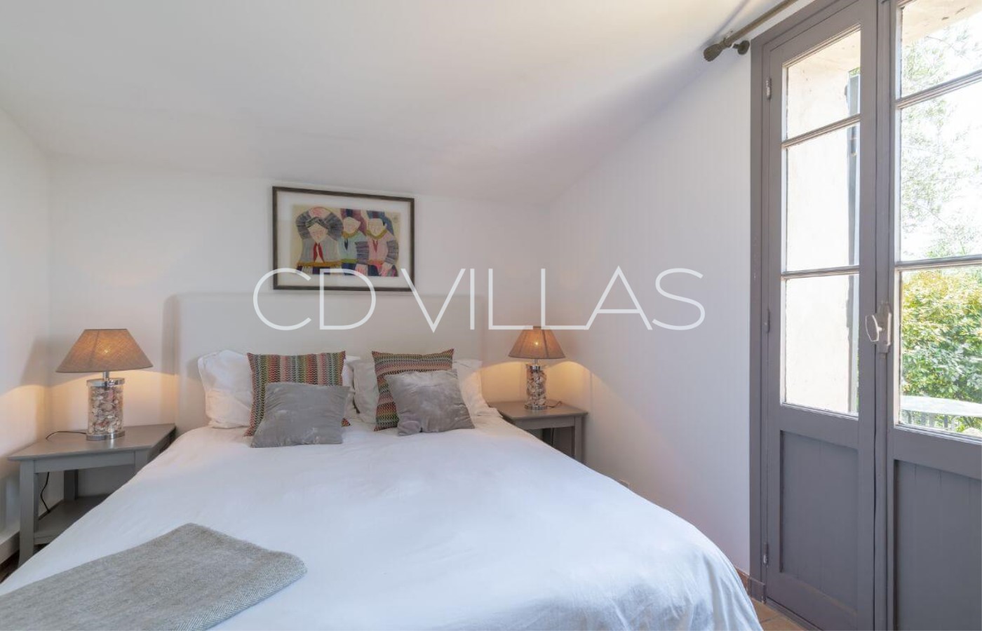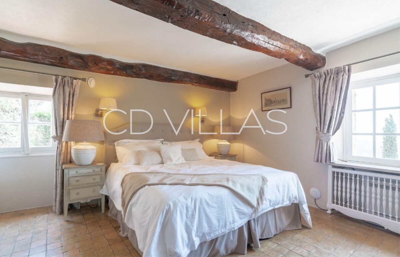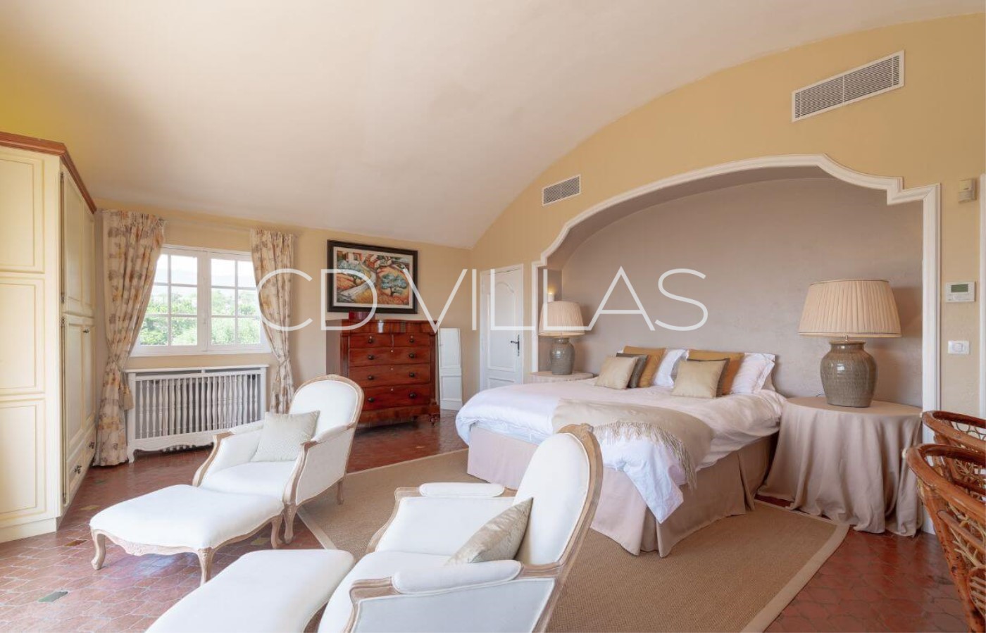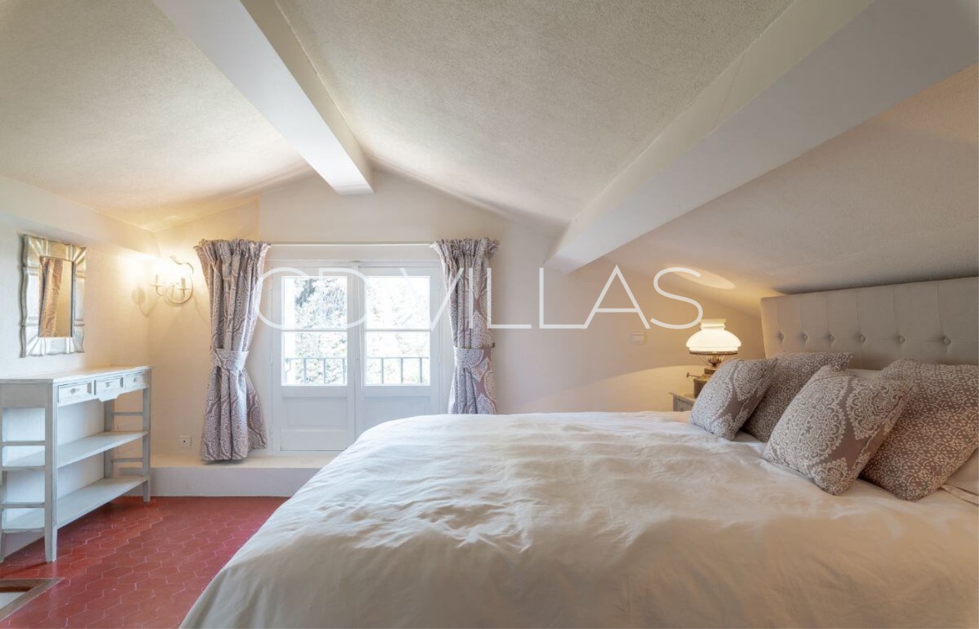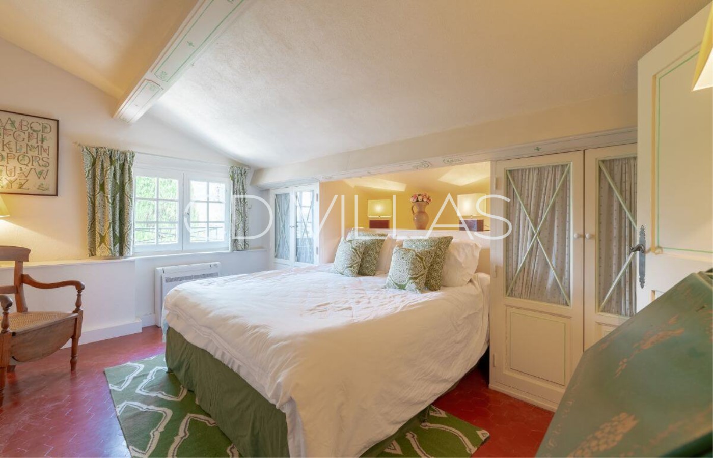 Hauptschlafzimmer mit extra großem Dopplebett und antike gefliestem