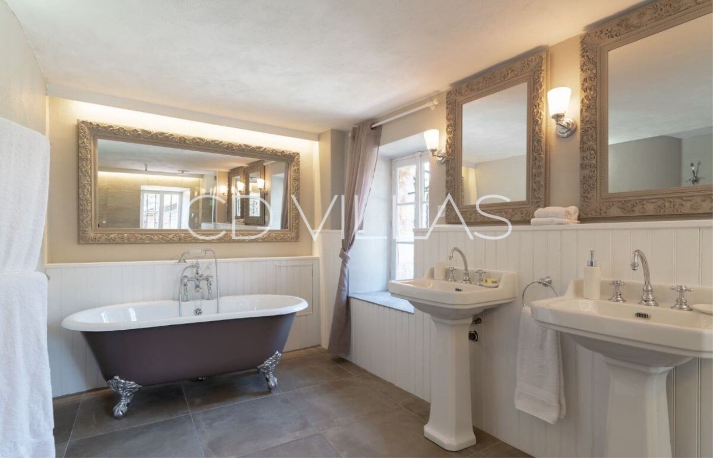 Badezimmer an. Große Türen öffnen auf einen Balkon mit