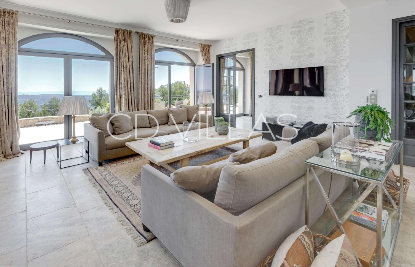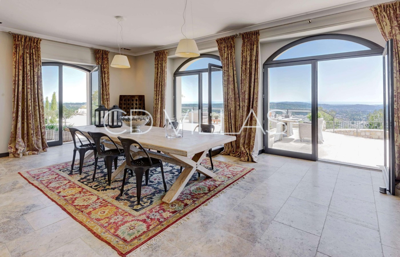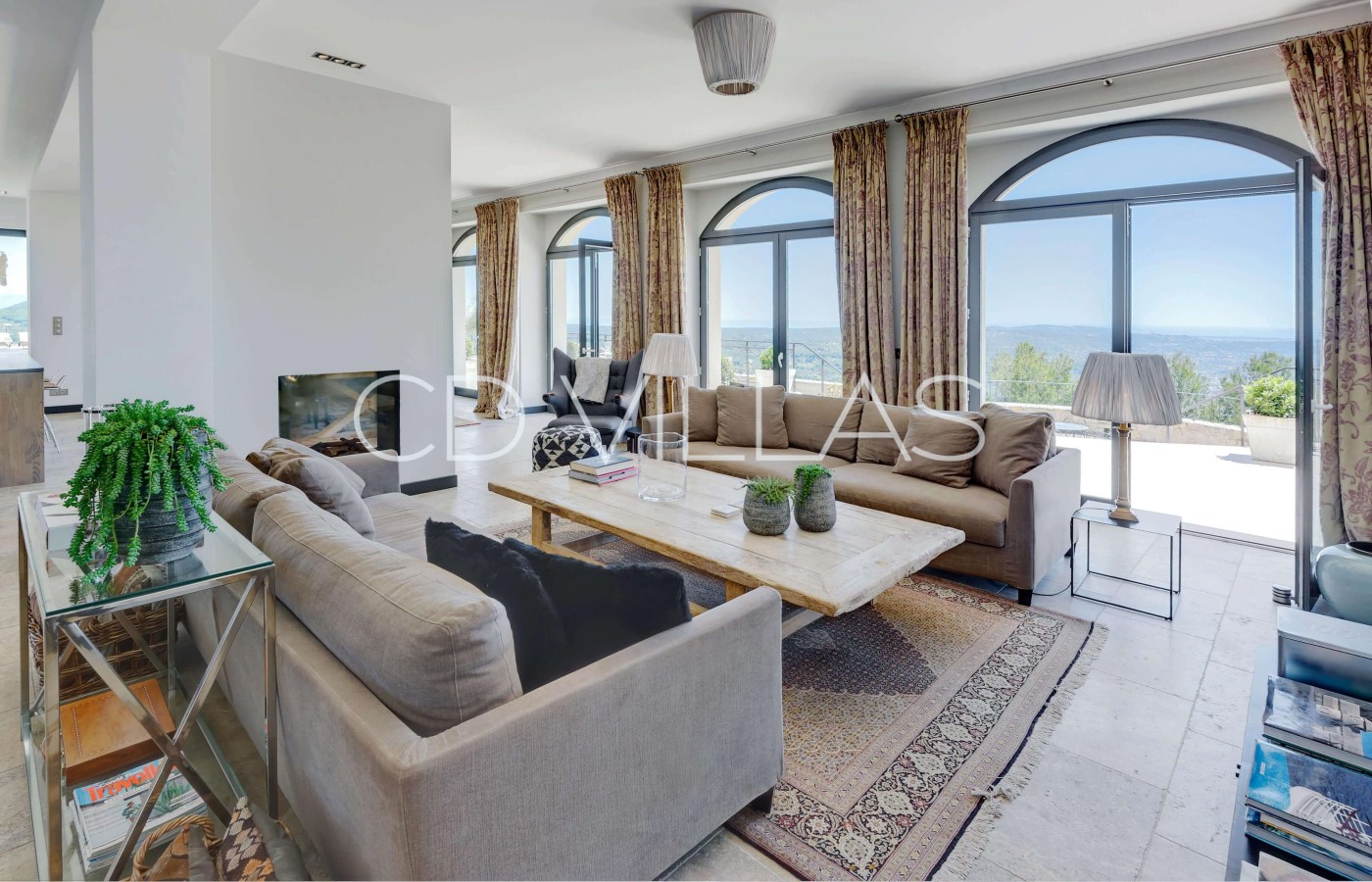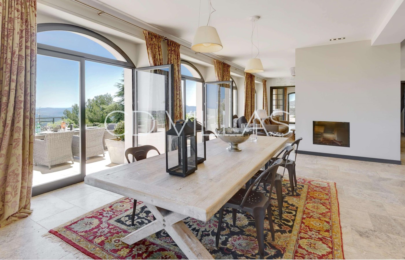 Der geräumige offene Wohnbereich mit Kamin, TV (Netflix und Apple TV) und großem Esstisch hat bequemen Platz für 10 Gäste. Der helle, geräumige Wohnbereich profitiert von der atemberaubender Aussicht und führt direkt auf eine Außenterrasse.