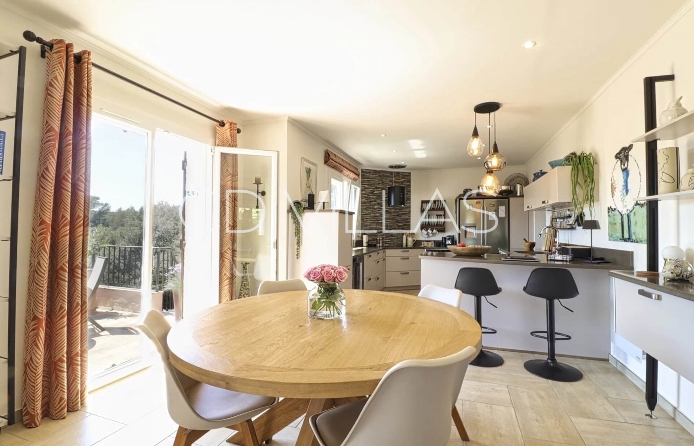 Das große Wohnzimmer führt zum Essbereich und zur modernen Küche, die komplett ausgestattet ist, sowie zu einer schönen Terrasse mit Blick auf den Garten und Blick bis hin zum Meer.