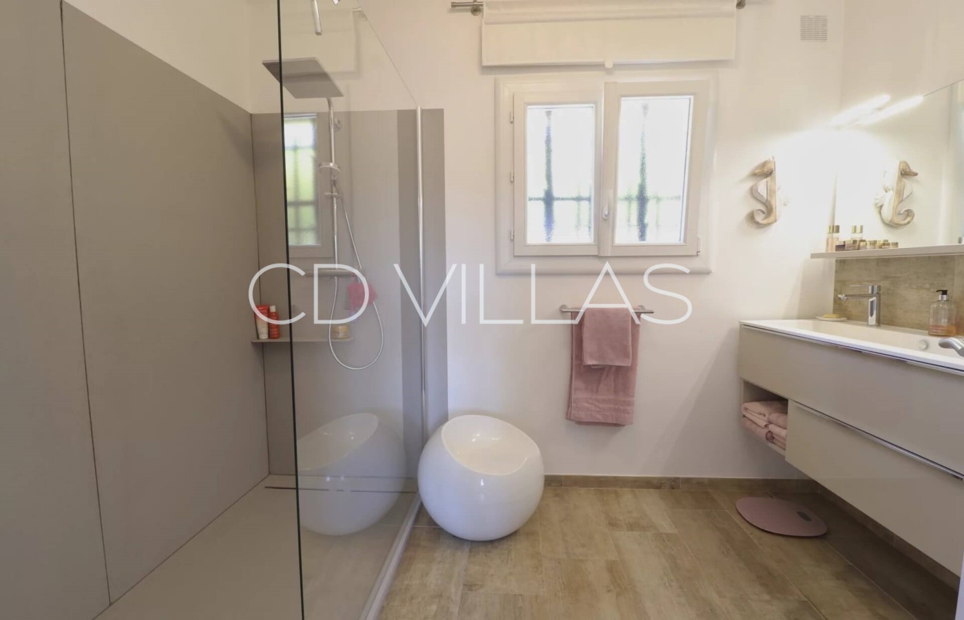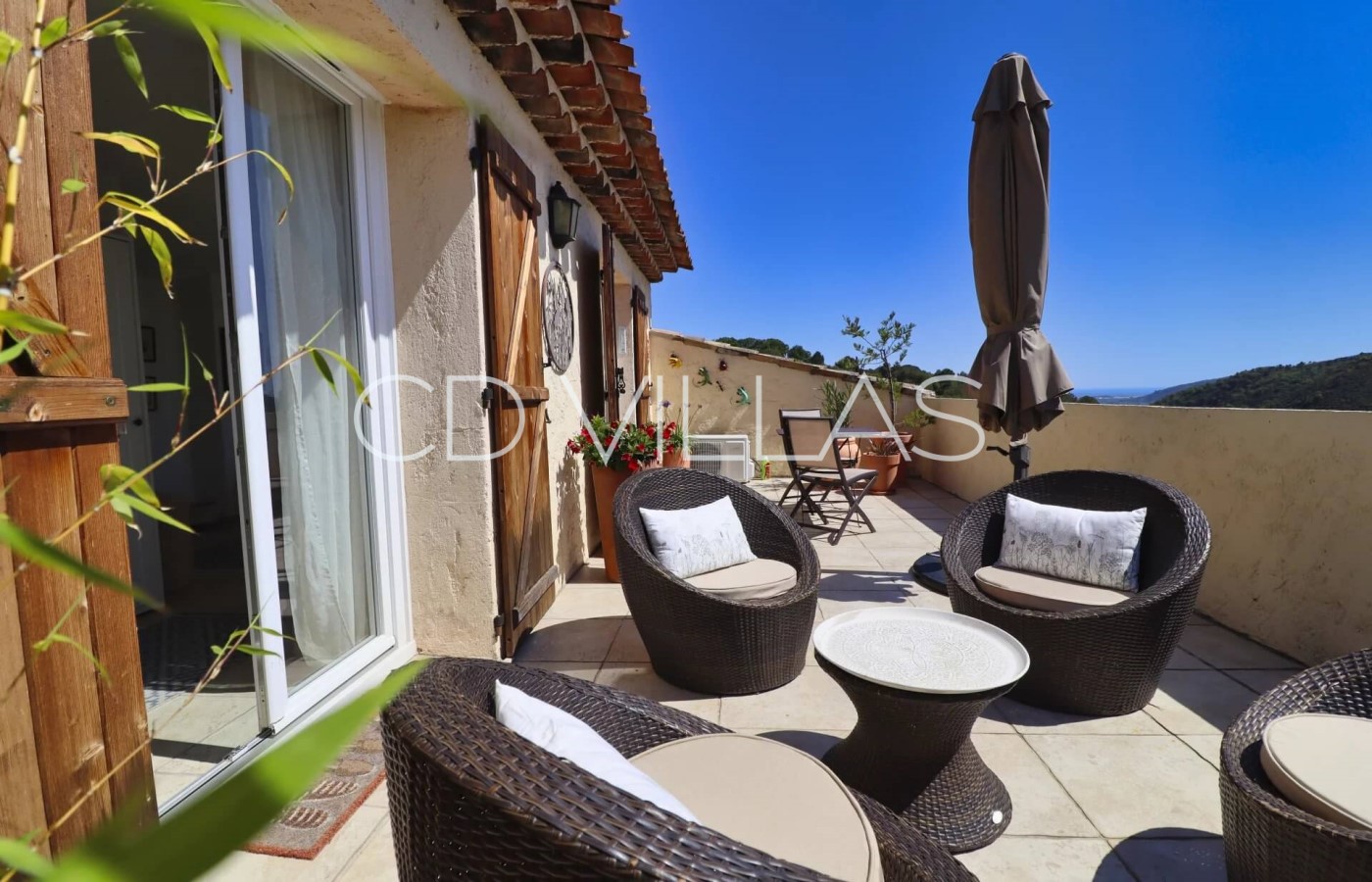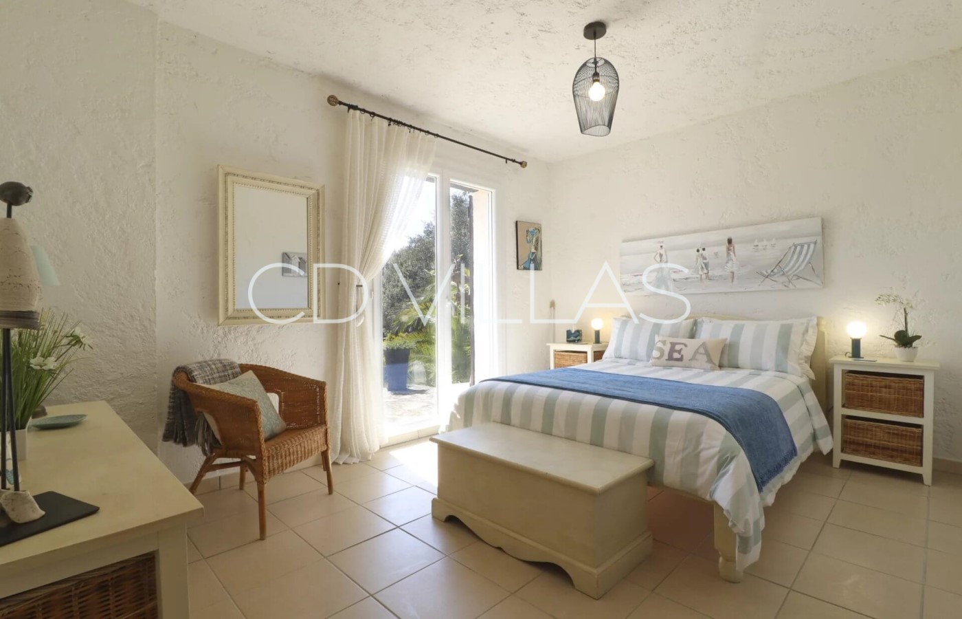Vom Hauptschlafzimmer aus genießen die Gäste einen herrlichen Blick über die umliegende Landschaft und bis hinunter zum Meer. Das Schlafzimmer verfügt über ein eigenes Duschbad und öffnet zu einem großen Balkon mit bequemen Liegestühlen. Ideal für etwas mehr Privatsphäre und Entspannung.