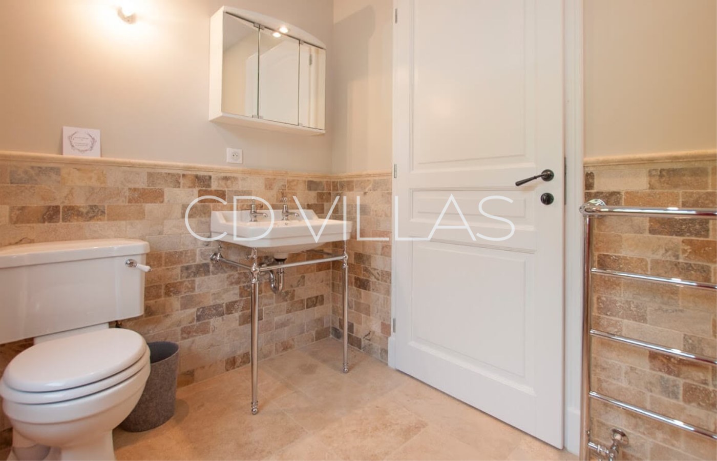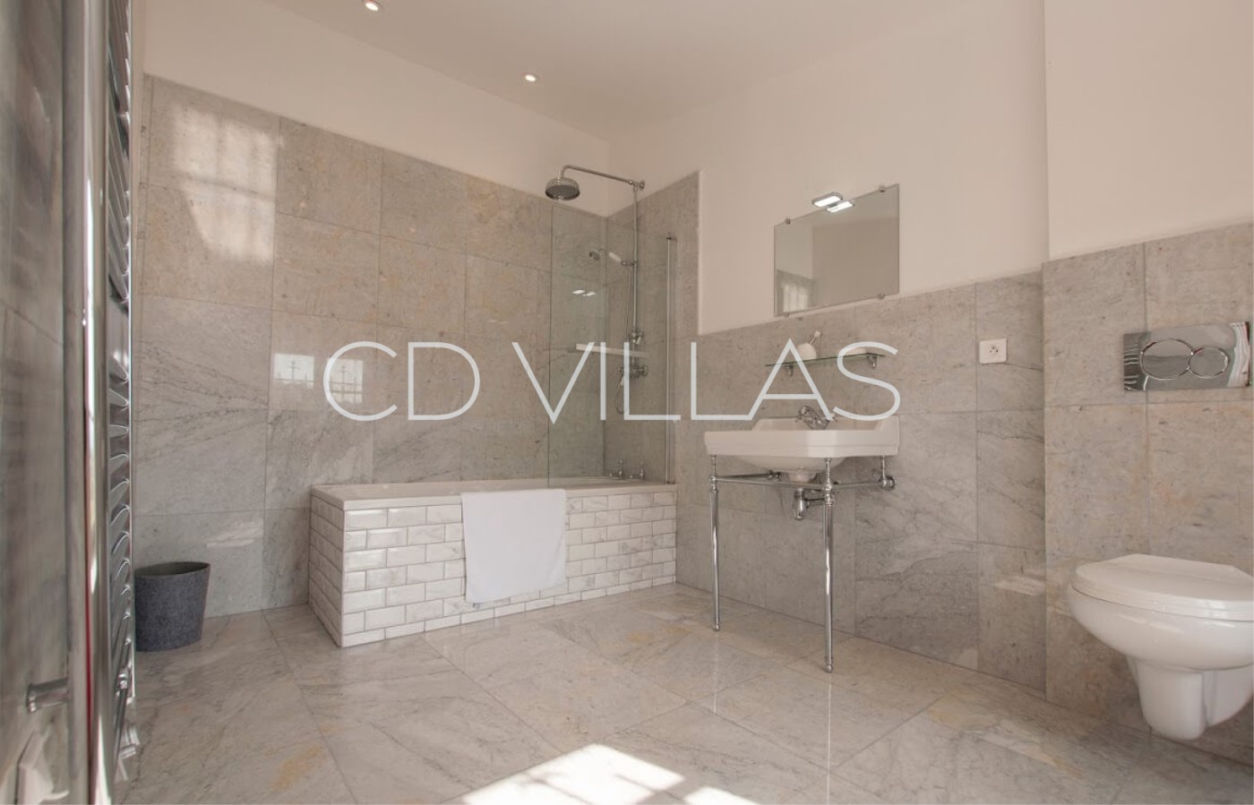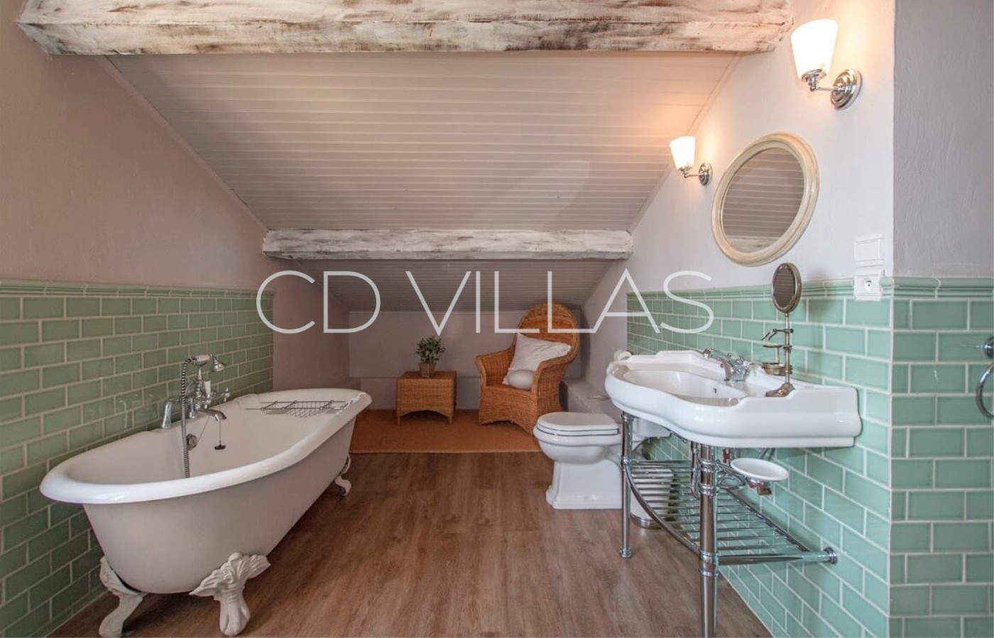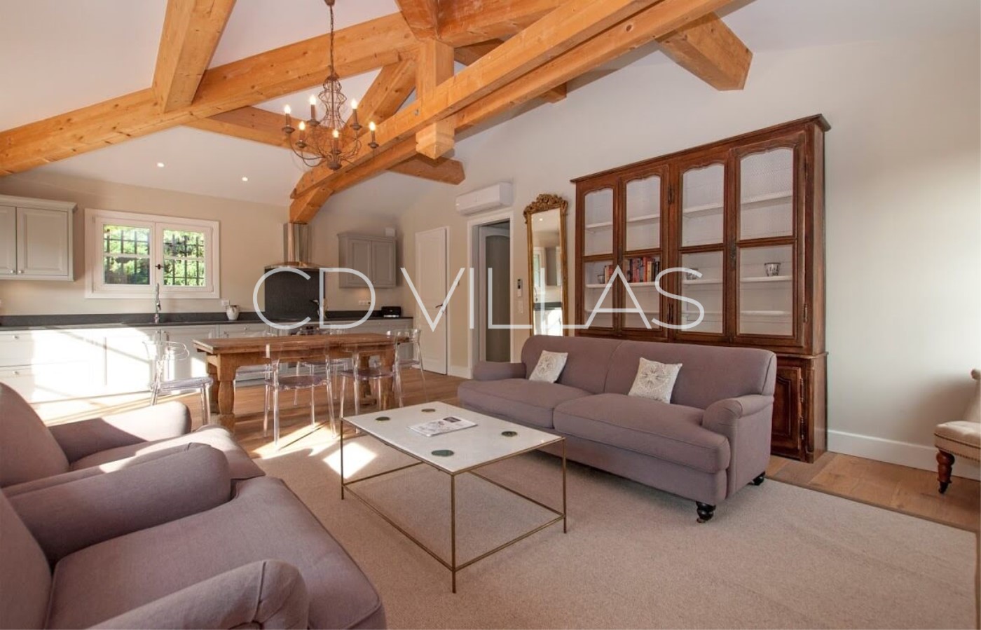 Das Haupthaus bietet 6 wunderschön eingerichtete Schlafzimmer, von denen sich 4 im ersten Stock und 2 im zweiten Stock befinden, und jedes Schlafzimmer ist mit einem eigenen Badezimmer ausgestattet. Es gibt auch ein stilvolles, geräumiges Büro im ersten Stock, das sich ideal zum Arbeiten aus der Ferne eignet.