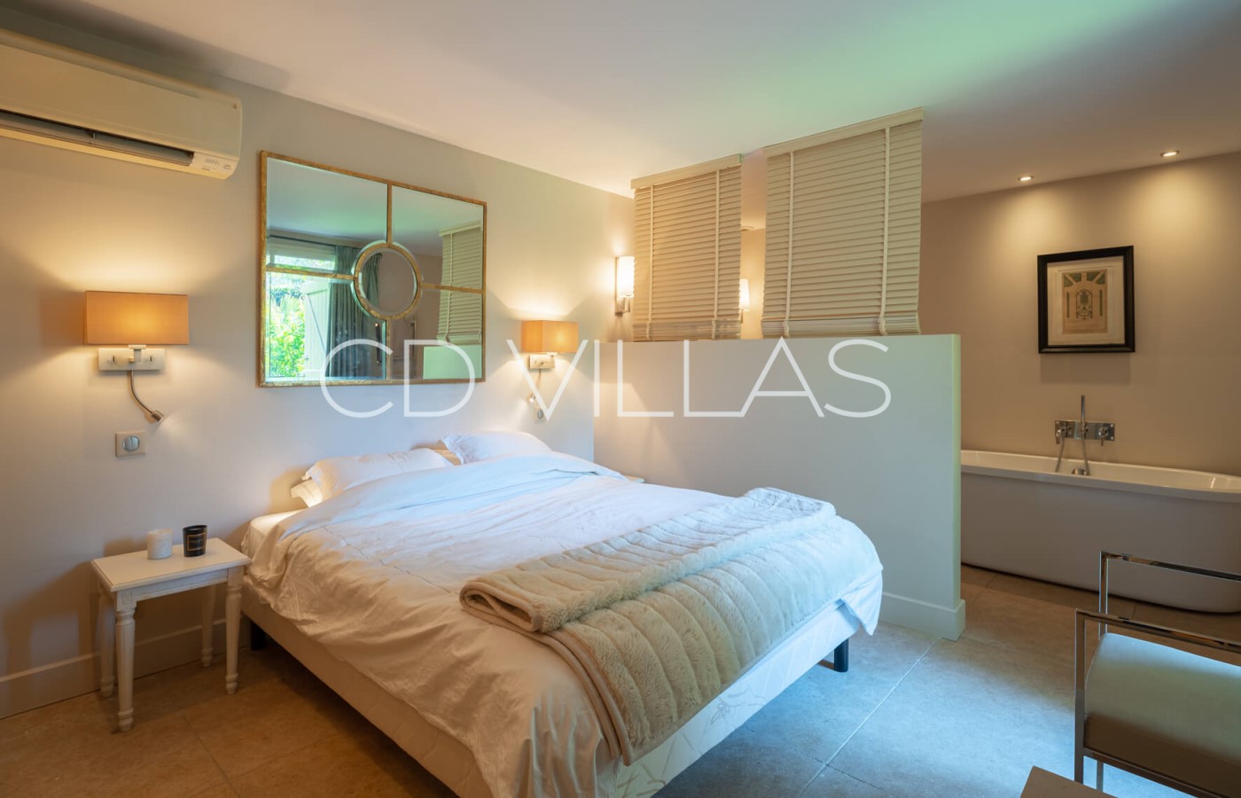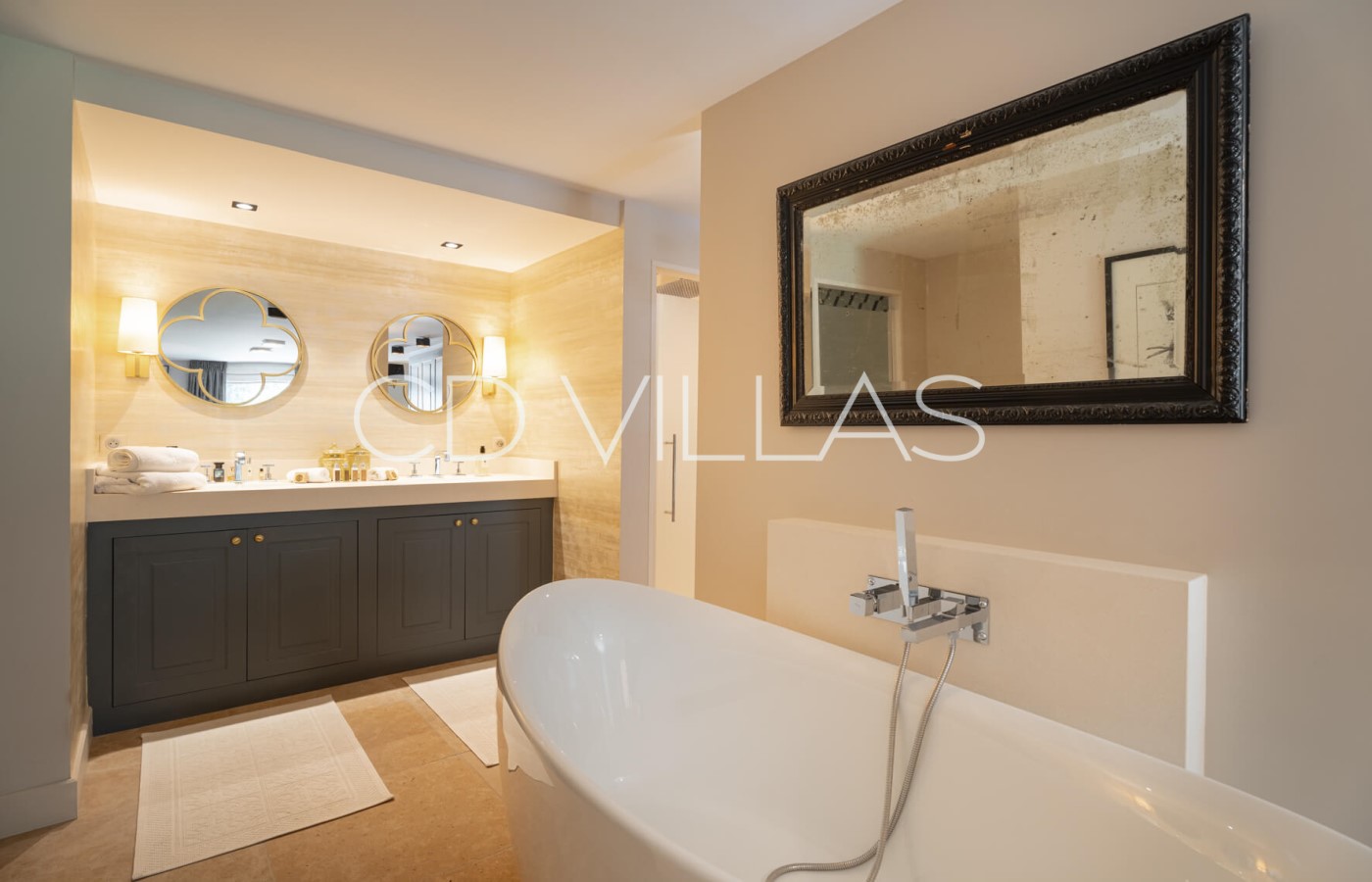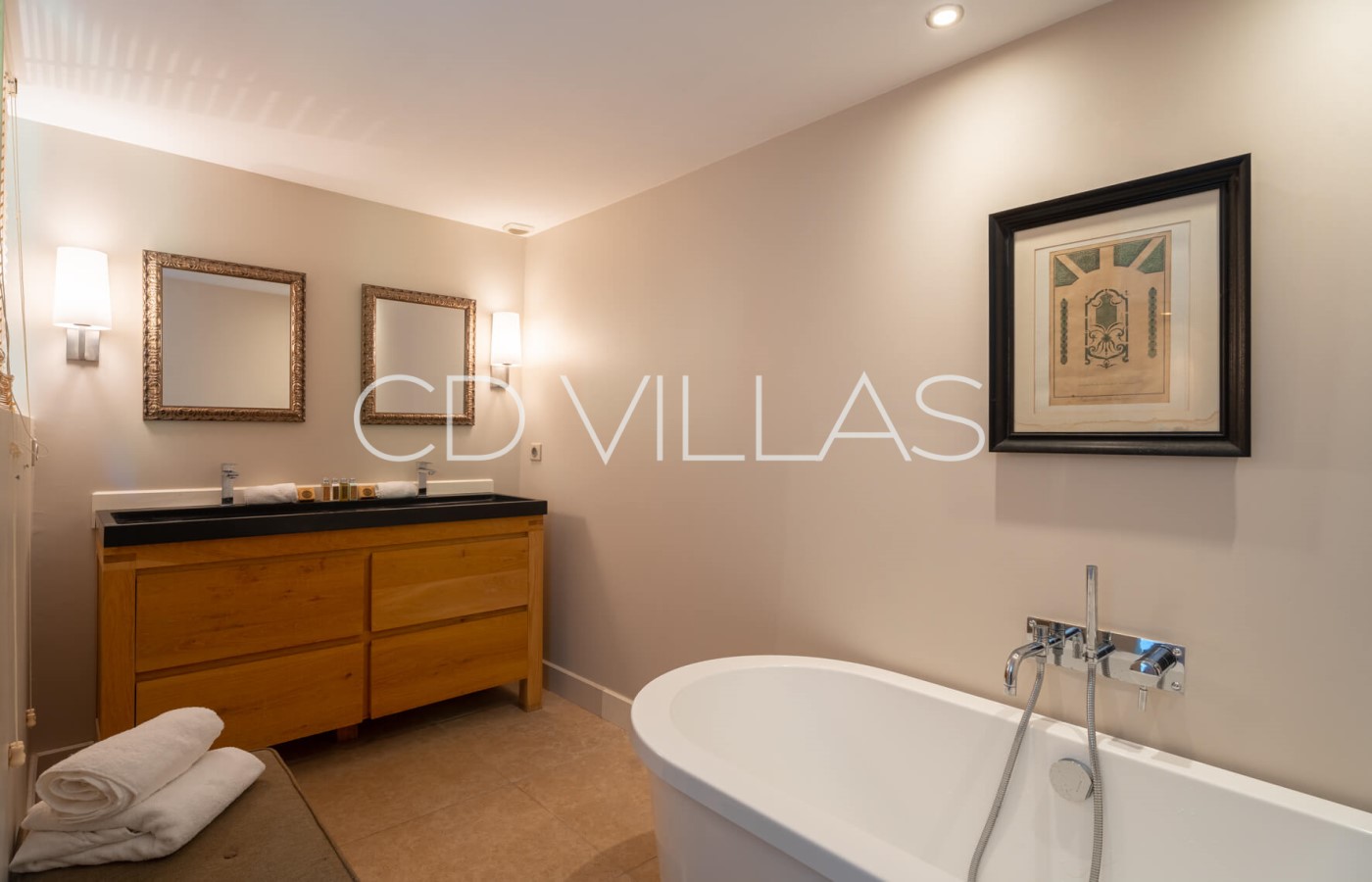 Bedroom 2 - Double bedroom with large double bed, direct access to the garden, air-conditioning and ensuite bathroom with bath/shower and double vanity.