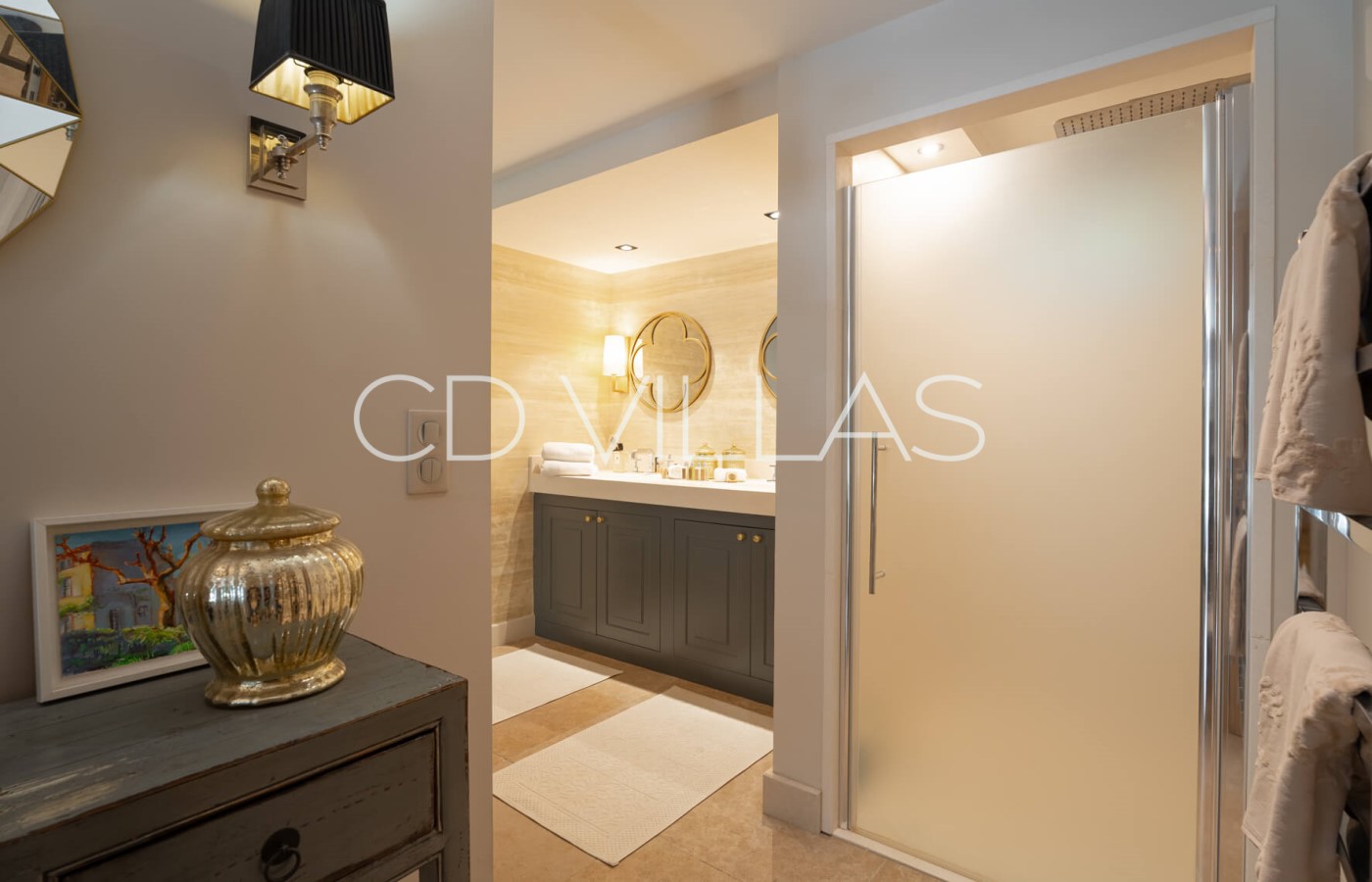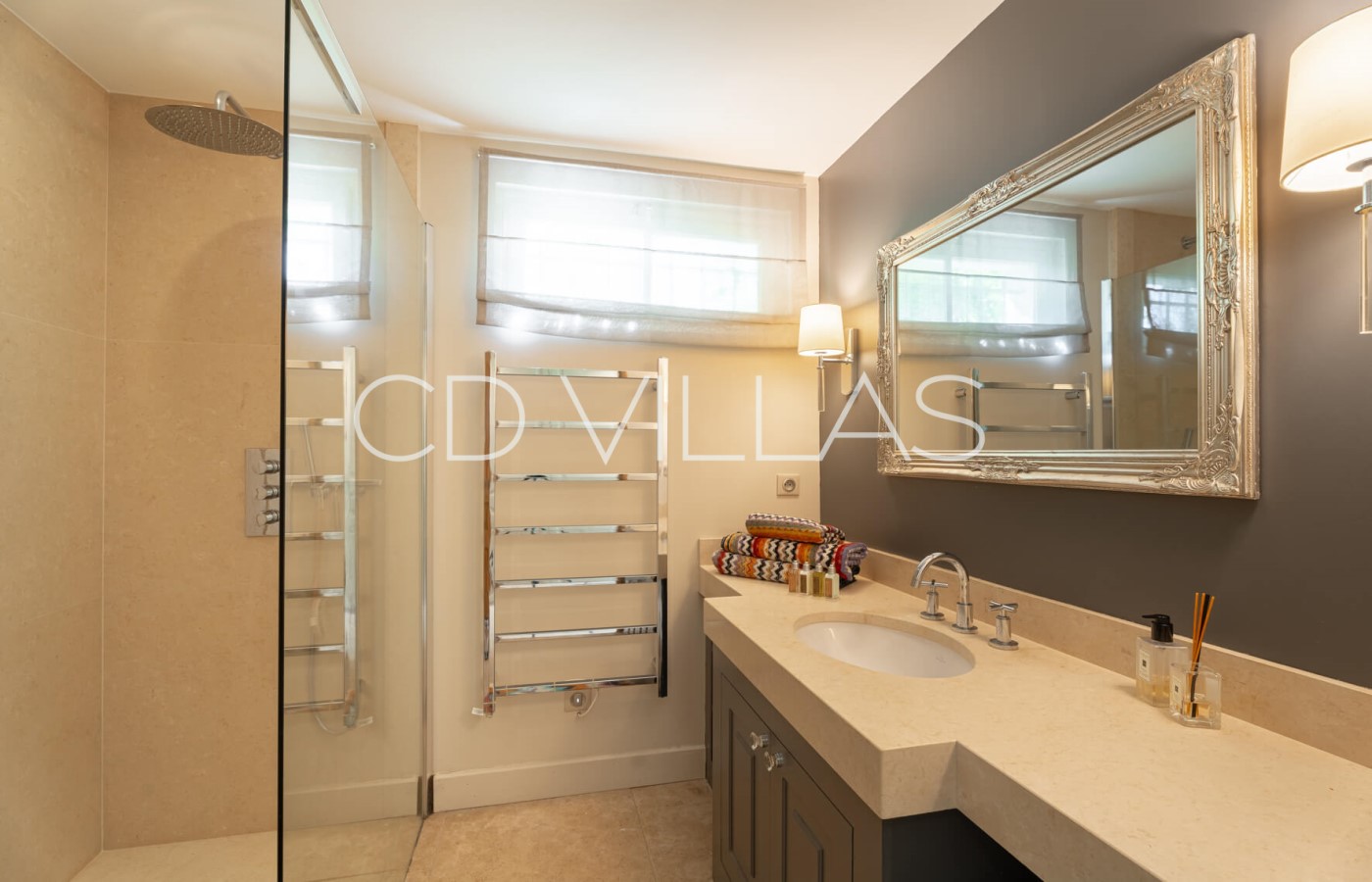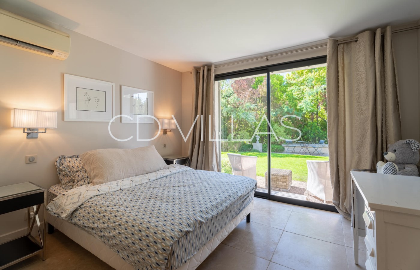 Bedroom 2 - Double bedroom with large double bed, direct access to the garden, air-conditioning and ensuite bathroom with bath/shower and double vanity.