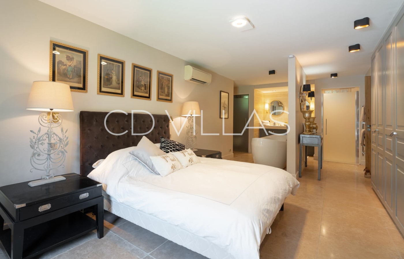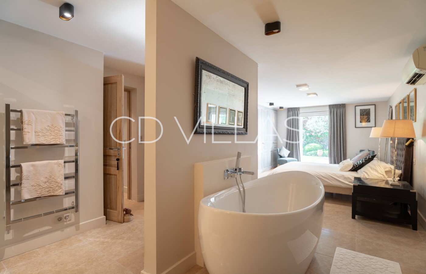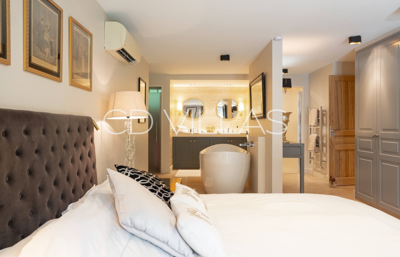 Bedroom 1 - Master bedroom with large double bed, direct access to the garden and ensuite bathroom with bathtub, shower, double vanity and toilet. The room is also equipped with a flat screen television