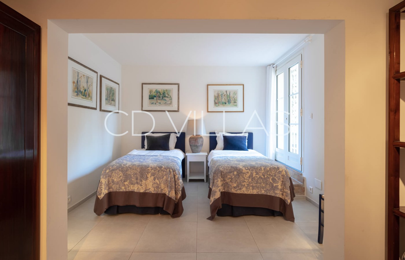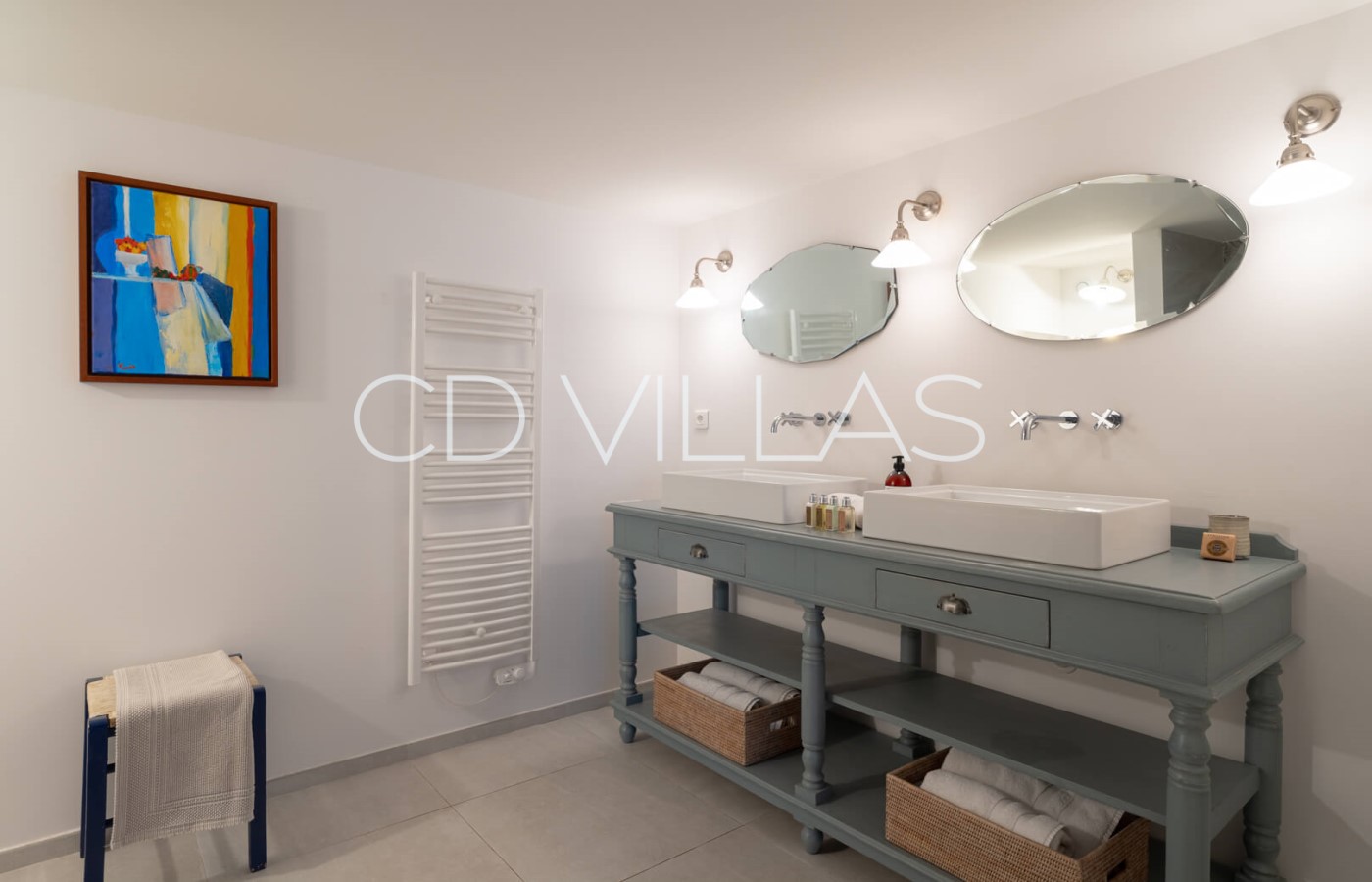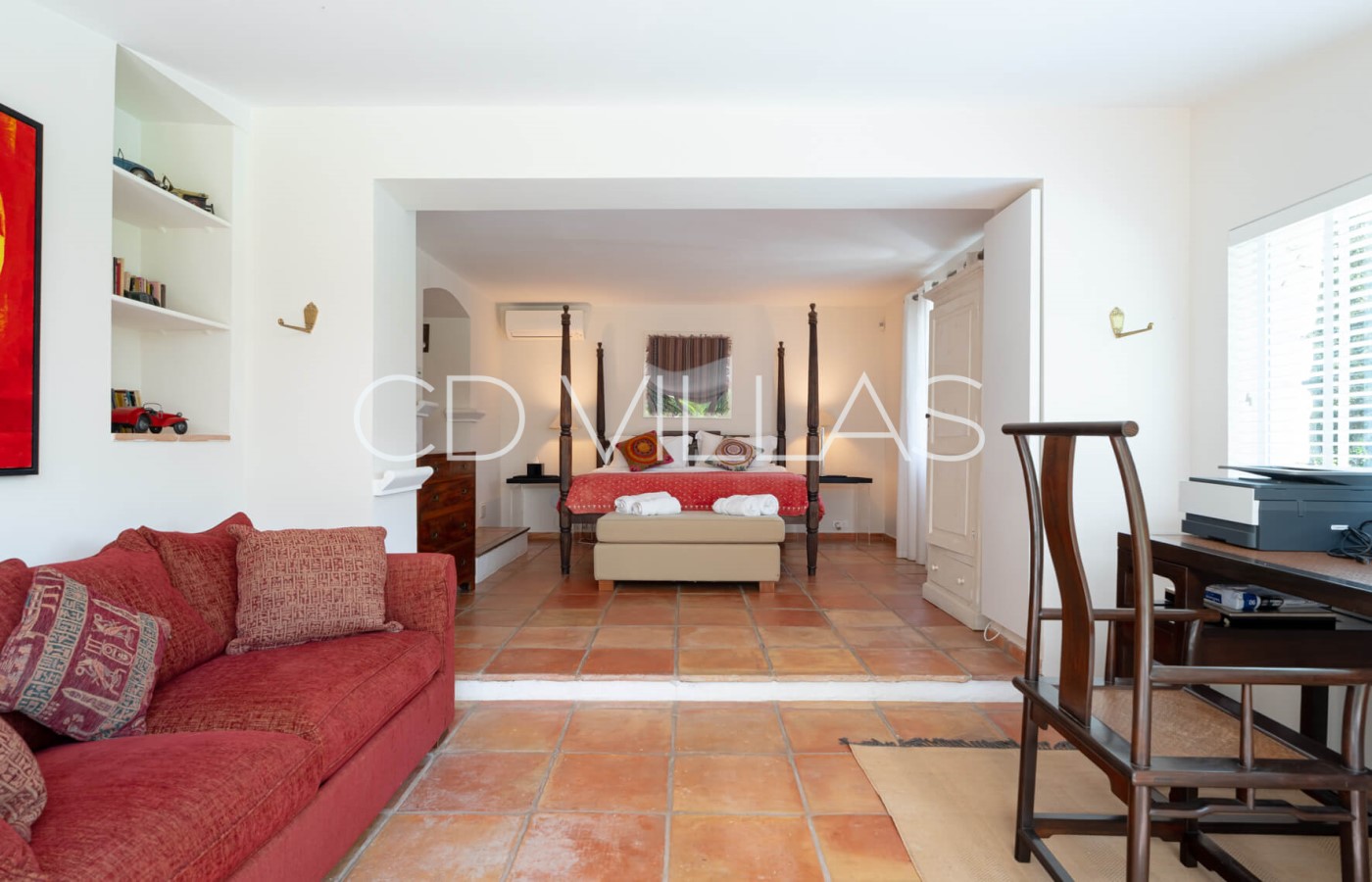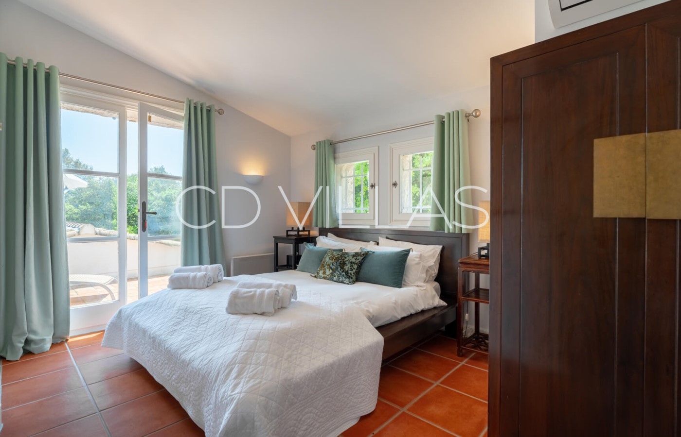Schlafzimmer 1 - Hauptschlafzimmer mit großem Doppelbett, Bürobereich und Privatem Badezimmer. Öffnet sich zum Garten- und Poolbereich.