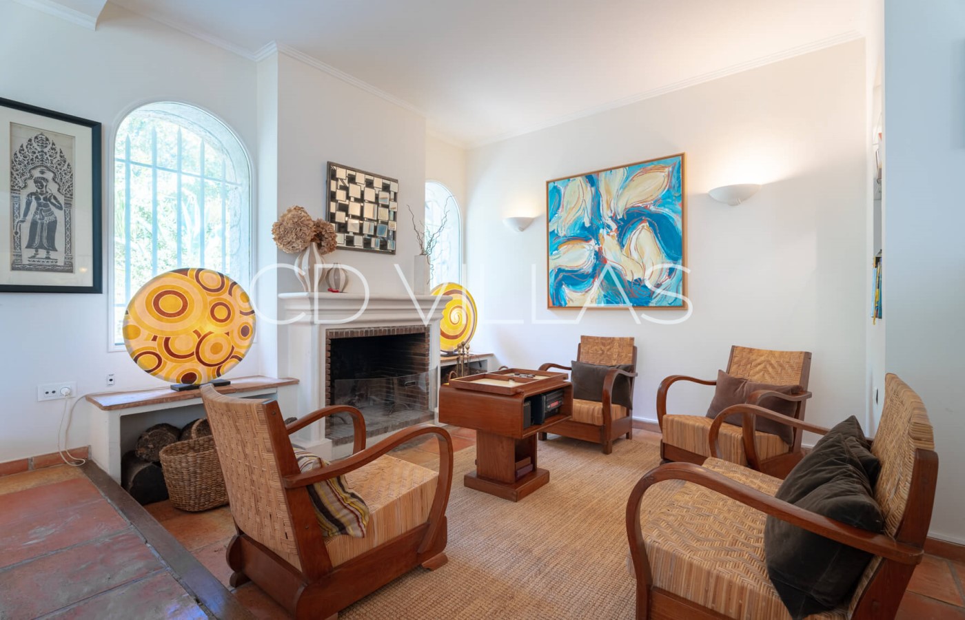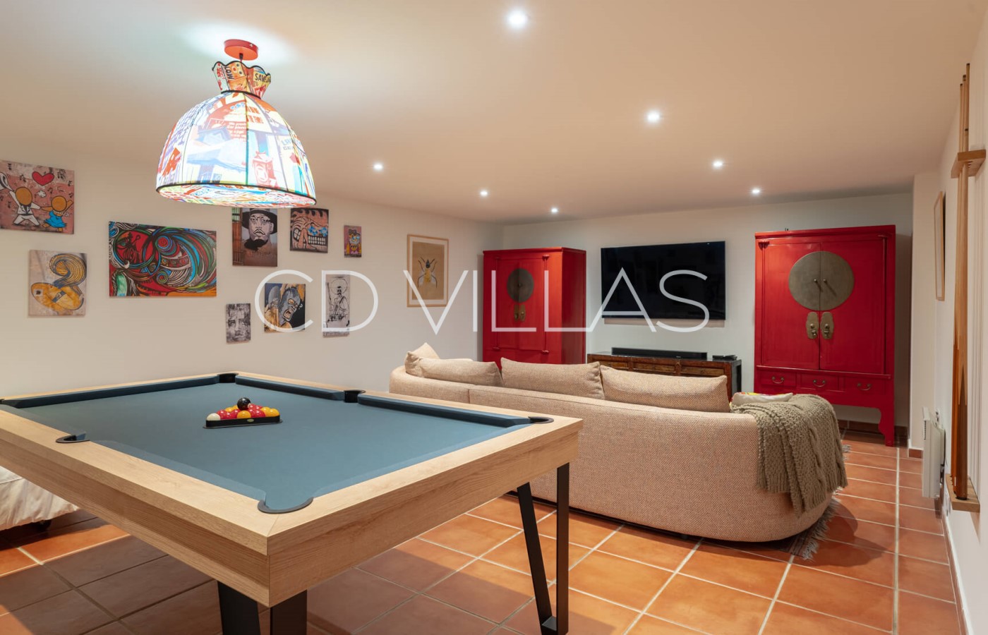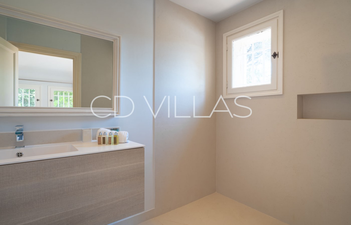 Schlafzimmer 1 - Hauptschlafzimmer mit großem Doppelbett, Bürobereich und Privatem Badezimmer. Öffnet sich zum Garten- und Poolbereich.
