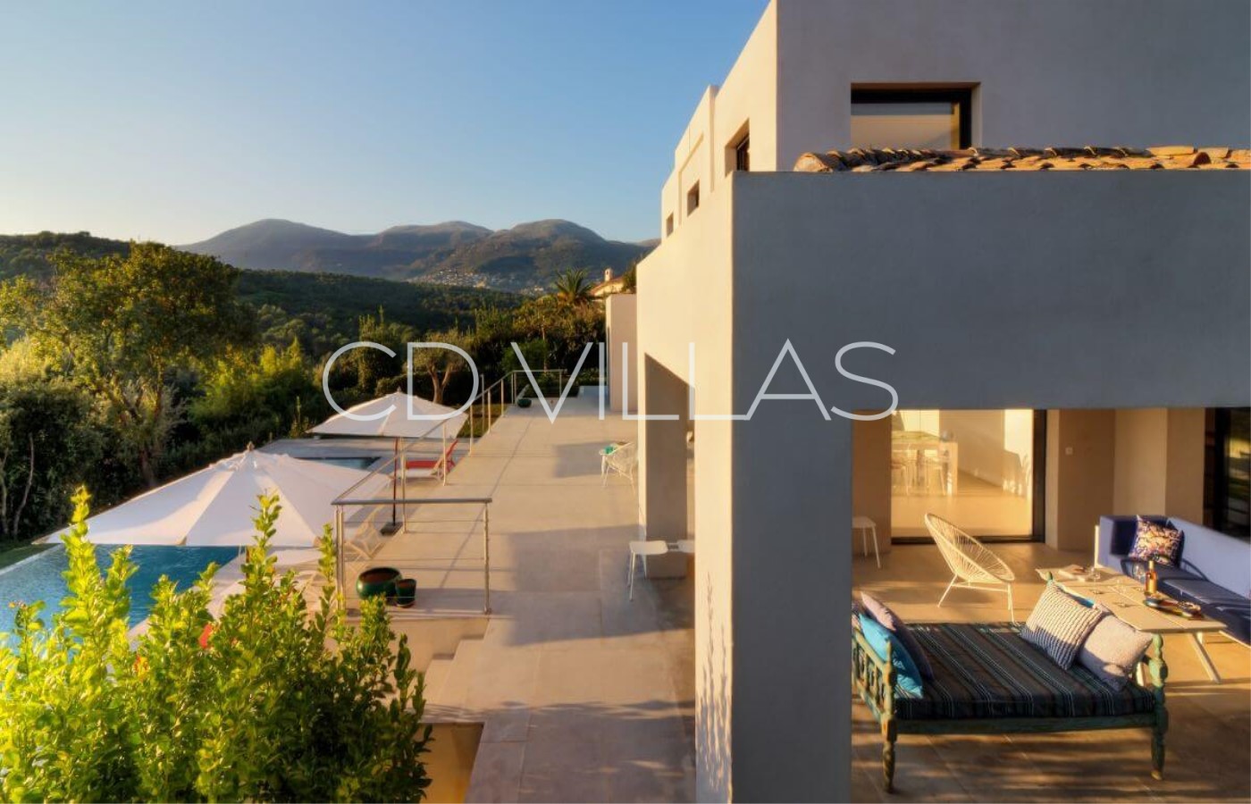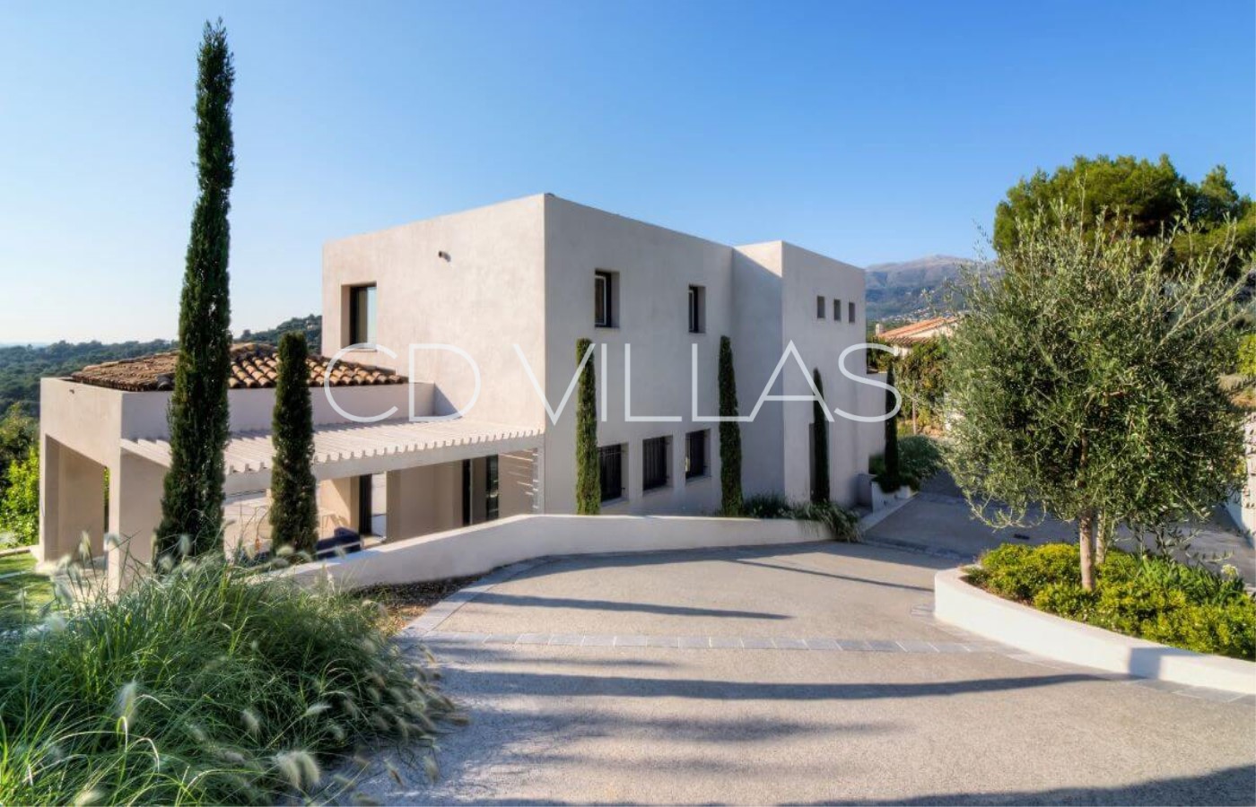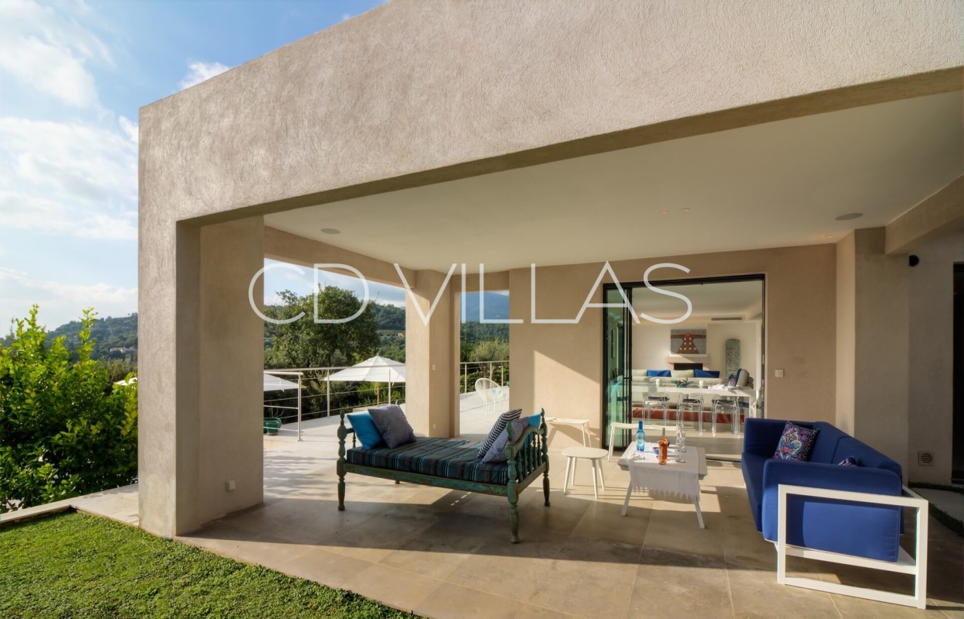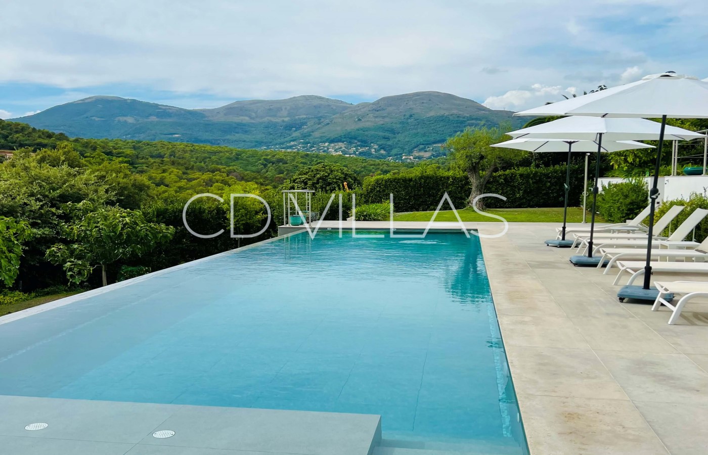 Eine fabelhafte, moderne Villa zum höchsten Standard ausgestattet in der Nähe des Dorfes St. Paul de Vence. Die Villa bietet fünf geräumige Schlafzimmer auf 3 Etagen verteilt und ist voll klimatisiert. Im Erdgeschoss befindet sich ein heller Wohnbereich mit Esstisch und großen Schiebetüren zur Terrasse mit Blick auf den Pool. Von der Terrasse aus bieten sich Blicke auf den Infinity-Pool (beheizbar) und auf das Meer.