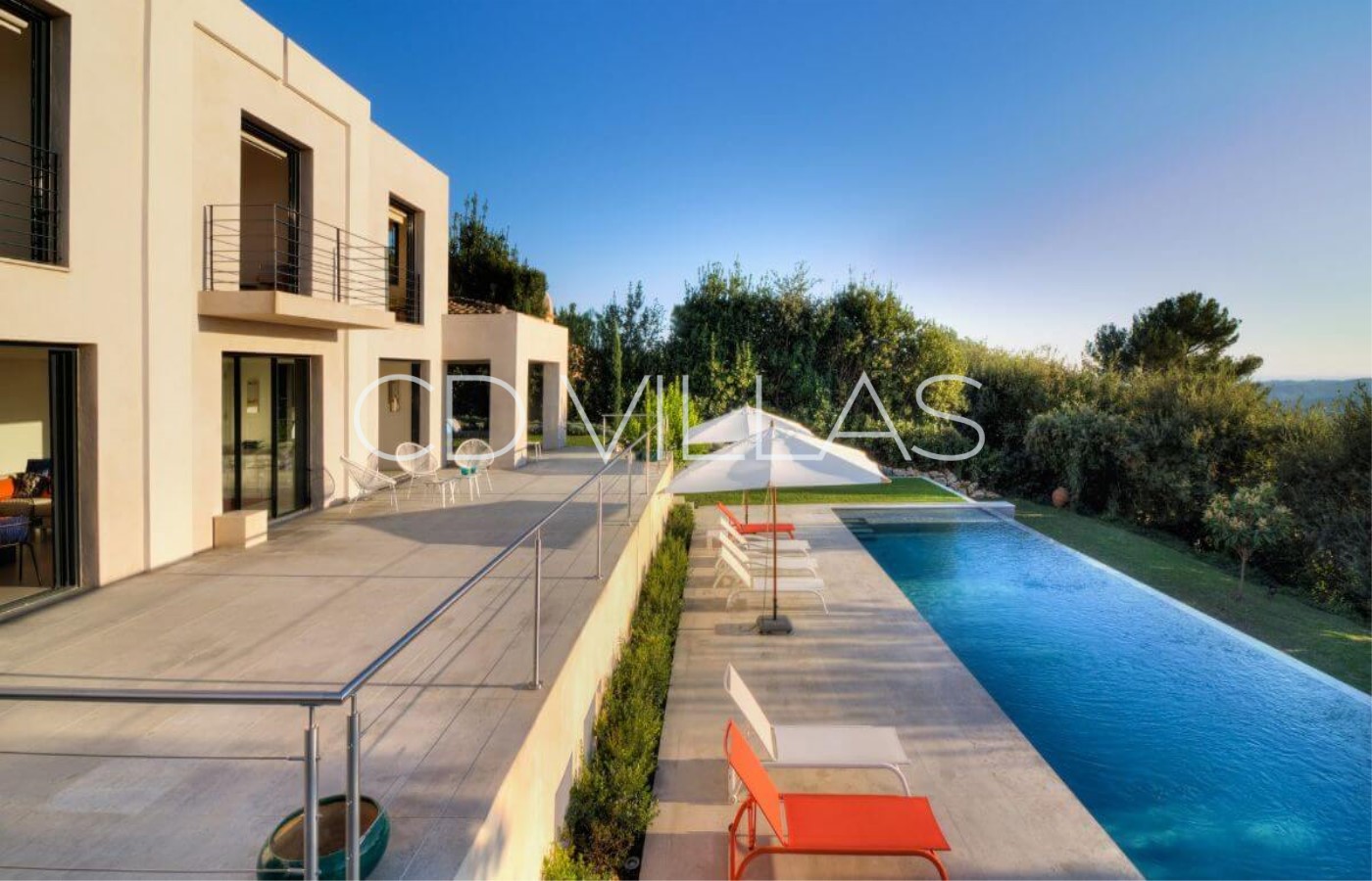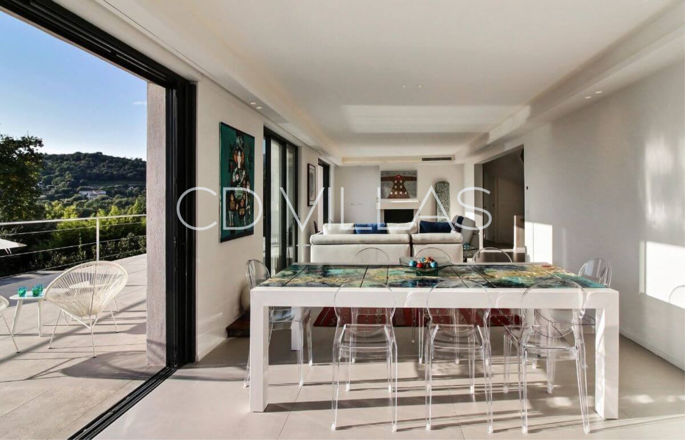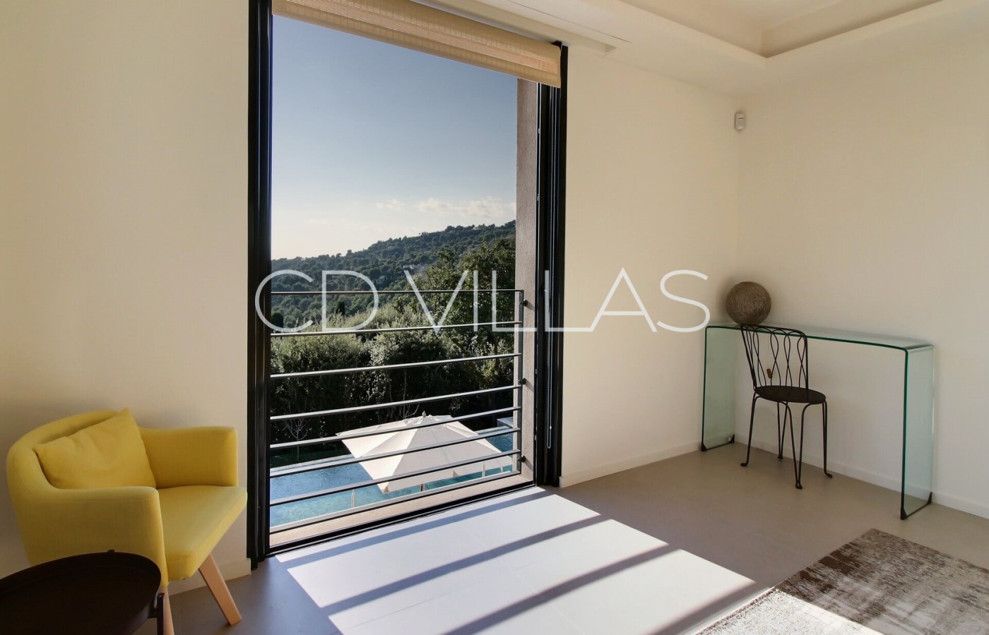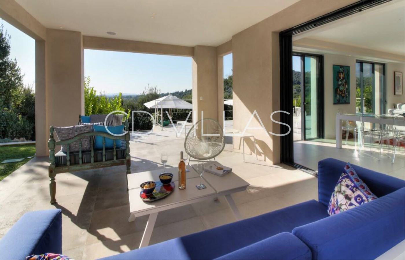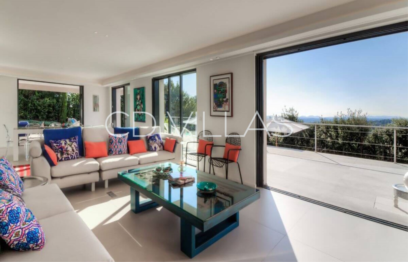 Eine fabelhafte, moderne Villa zum höchsten Standard ausgestattet in der Nähe des Dorfes St. Paul de Vence. Die Villa bietet fünf geräumige Schlafzimmer auf 3 Etagen verteilt und ist voll klimatisiert. Im Erdgeschoss befindet sich ein heller Wohnbereich mit Esstisch und großen Schiebetüren zur Terrasse mit Blick auf den Pool. Von der Terrasse aus bieten sich Blicke auf den Infinity-Pool (beheizbar) und auf das Meer.