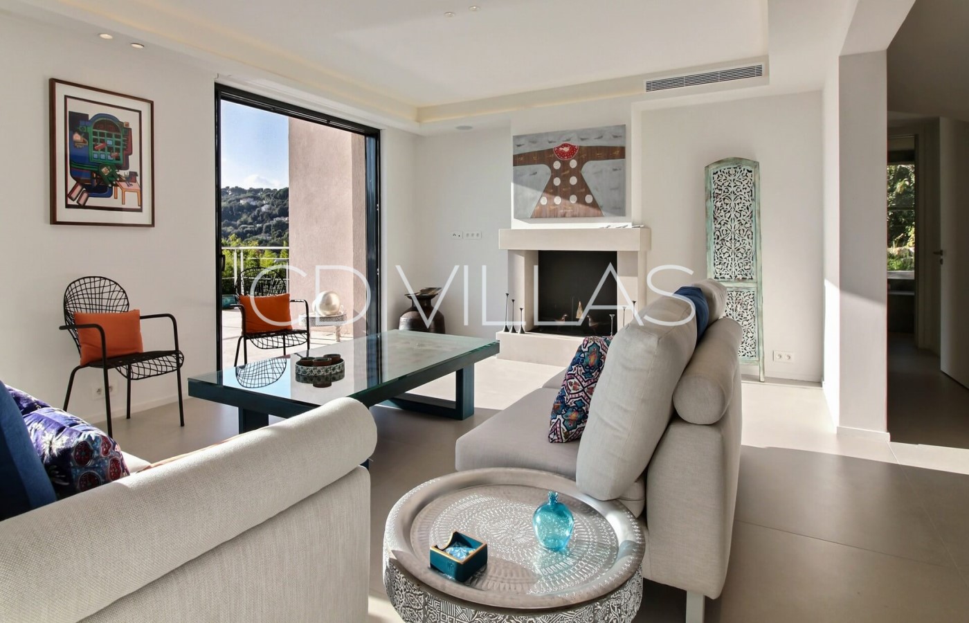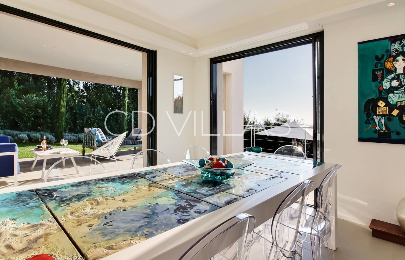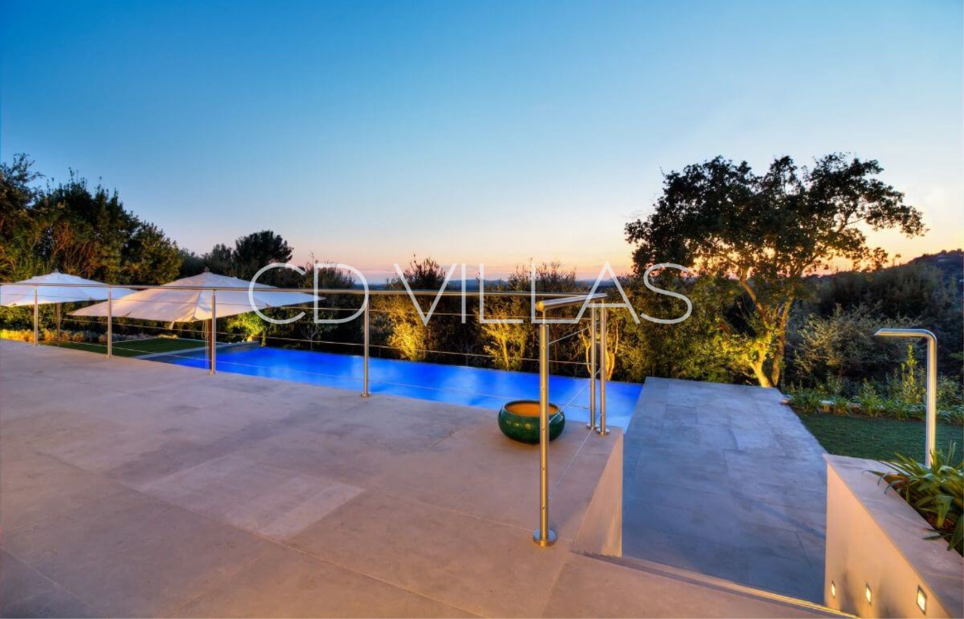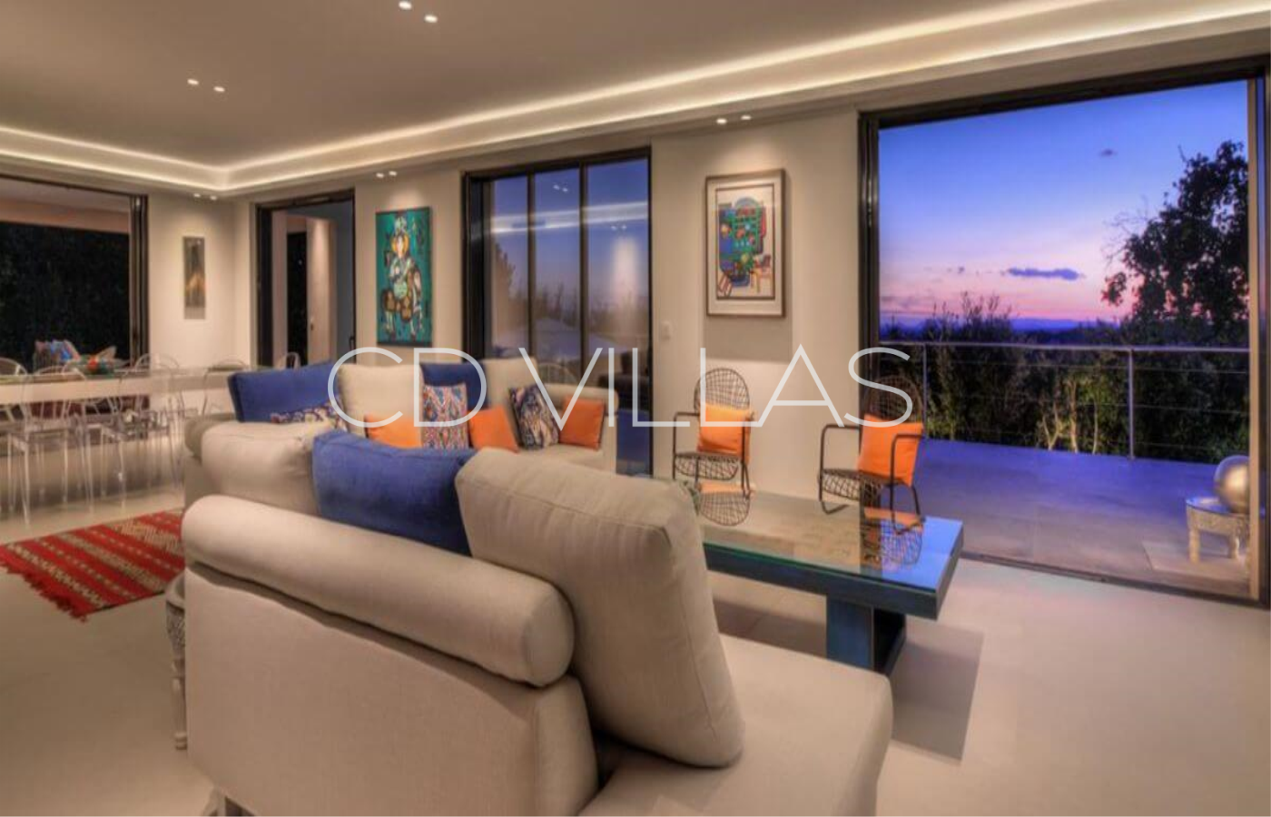 Eine fabelhafte, moderne Villa zum höchsten Standard ausgestattet in der Nähe des Dorfes St. Paul de Vence. Die Villa bietet fünf geräumige Schlafzimmer auf 3 Etagen verteilt und ist voll klimatisiert. Im Erdgeschoss befindet sich ein heller Wohnbereich mit Esstisch und großen Schiebetüren zur Terrasse mit Blick auf den Pool. Von der Terrasse aus bieten sich Blicke auf den Infinity-Pool (beheizbar) und auf das Meer.