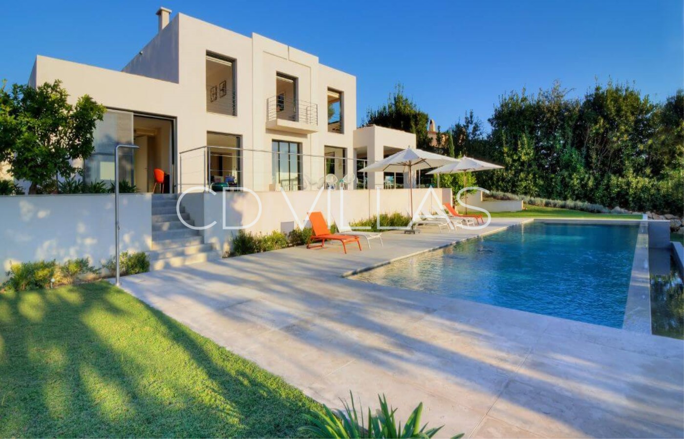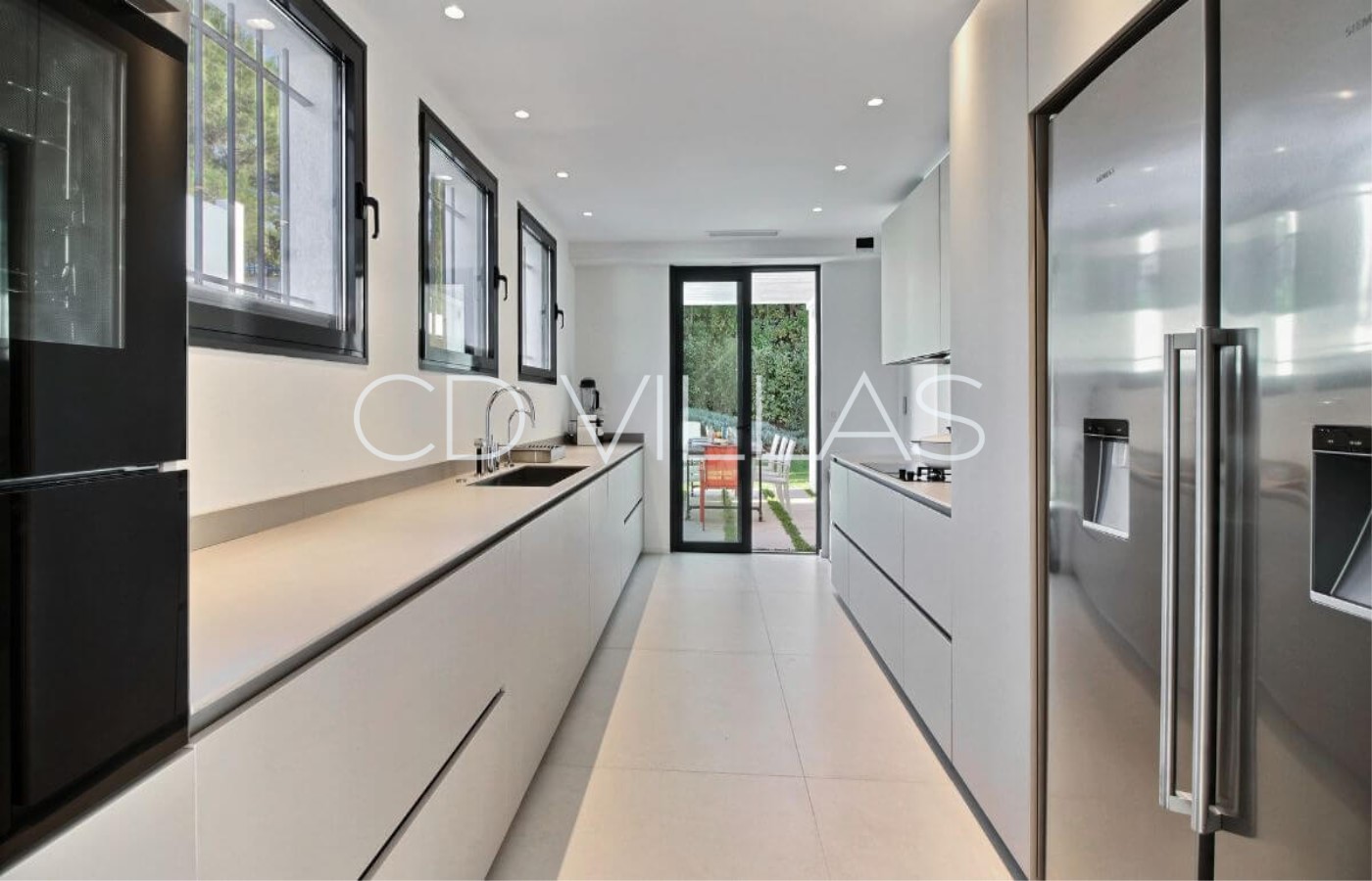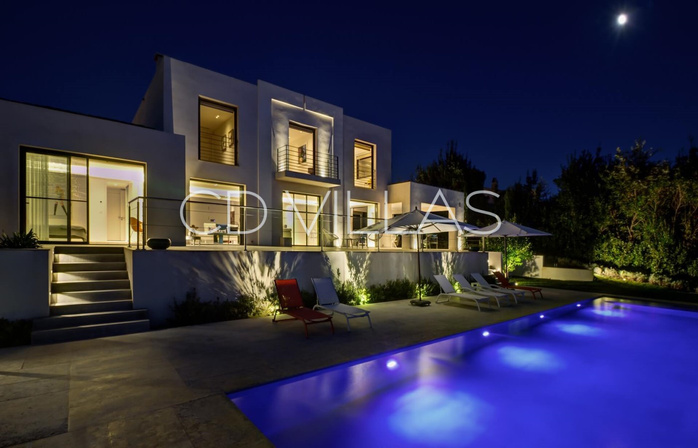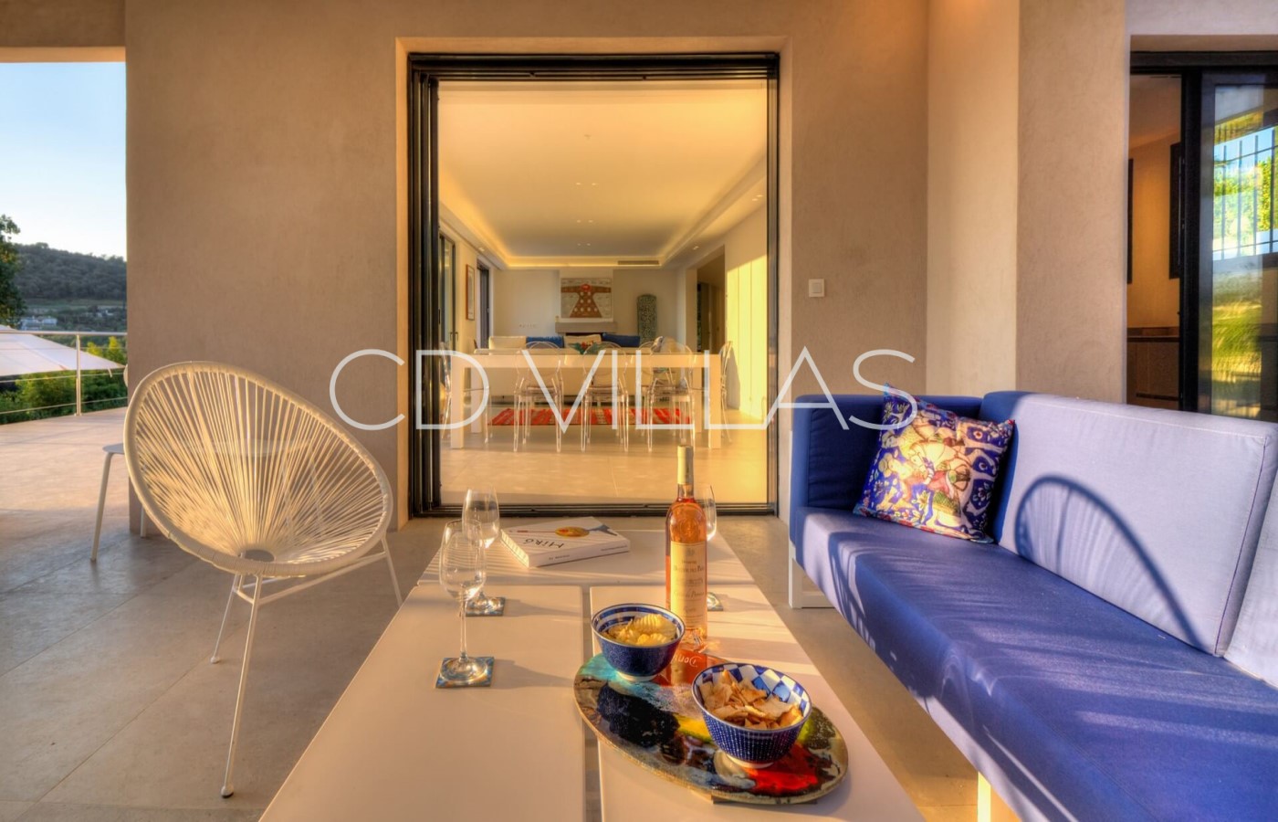 Die Villa wurde in einem modernen Stil eingerichtet und bietet eine gut ausgestattete moderne Küche mit Induktions- / Gasherd und amerikanischem Kühlschrank, ein großes Wohn- und Esszimmer, das sich zu einer schönen Terrasse hinaus öffnet, von der aus die Gäste den schönen Blick auf die Hügel und das Mittelmeer genießen können .