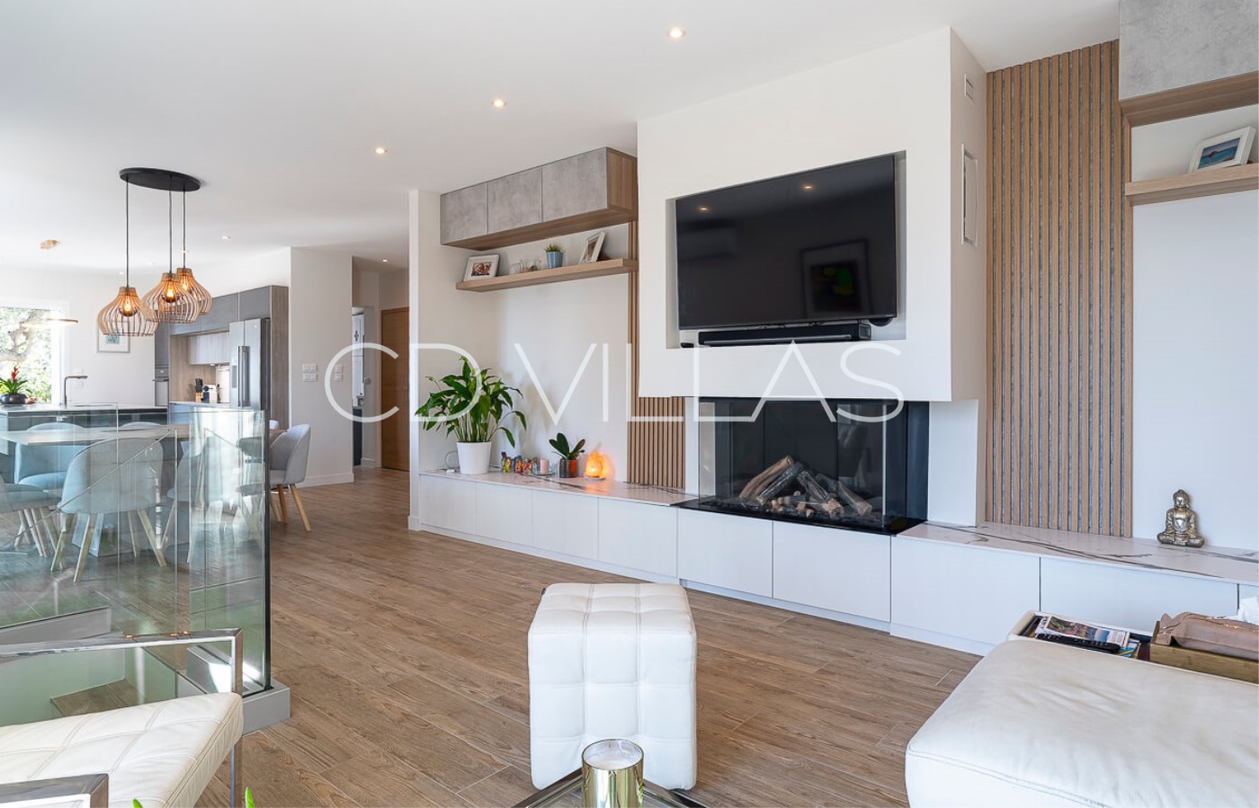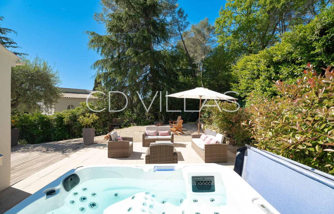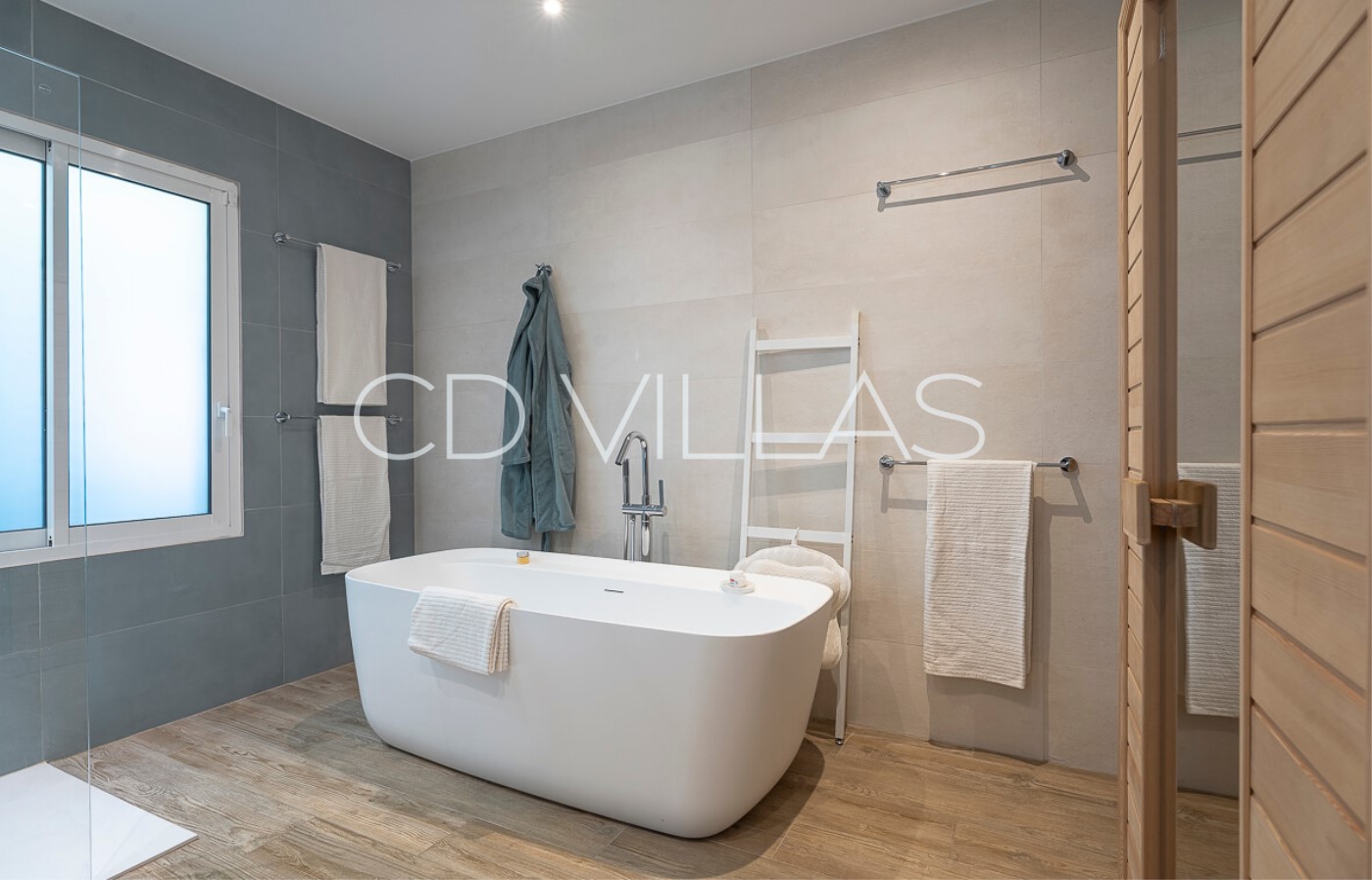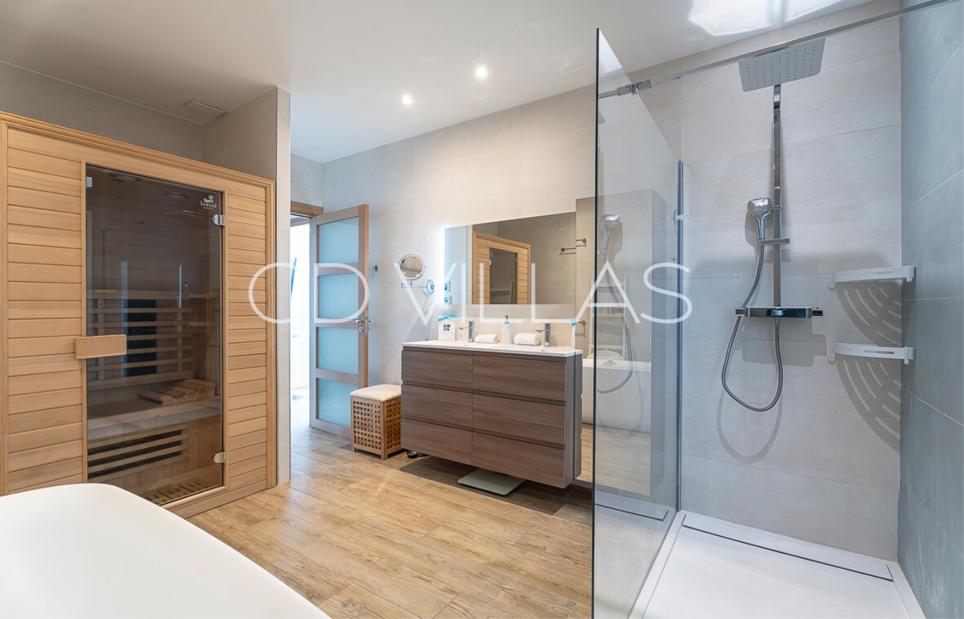 Das gesamte Haus ist mit Klimaanlage ausgestattet. Das Obergeschoss verfügt über eine offene Küche, ein Ess- und ein Wohnzimmer. Die voll ausgestattete moderne Küche öffnet sich zu einer großen Terrasse mit Blick auf den Garten und den Pool. Das Hauptschlafzimmer verfügt über ein großes eigenes Bad mit Sauna. Vom Schlafzimmer aus führen große Schiebetüren auf eine charmante und sehr private Terrasse mit Jacuzzi.