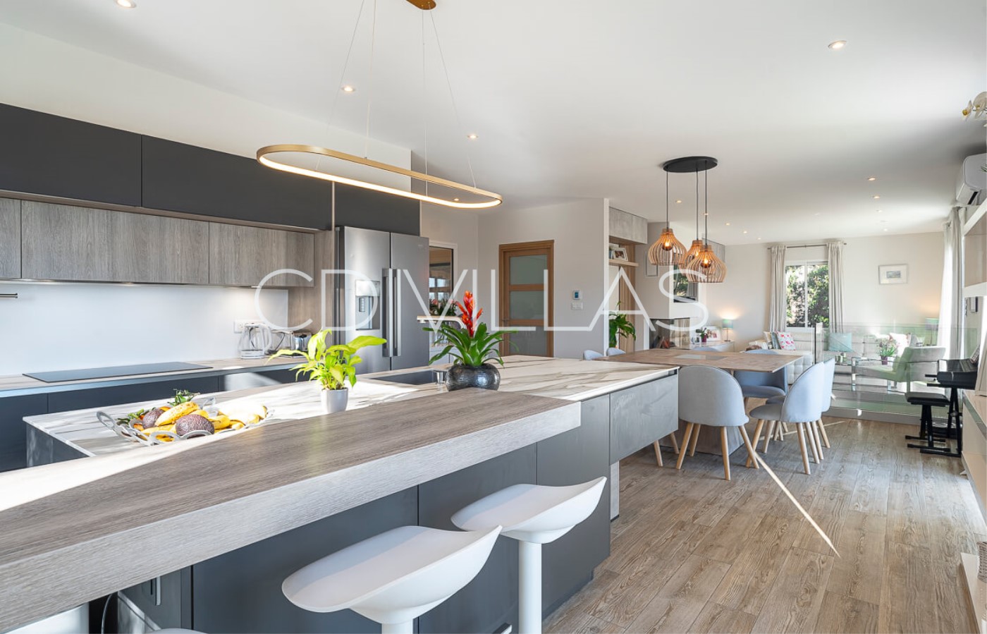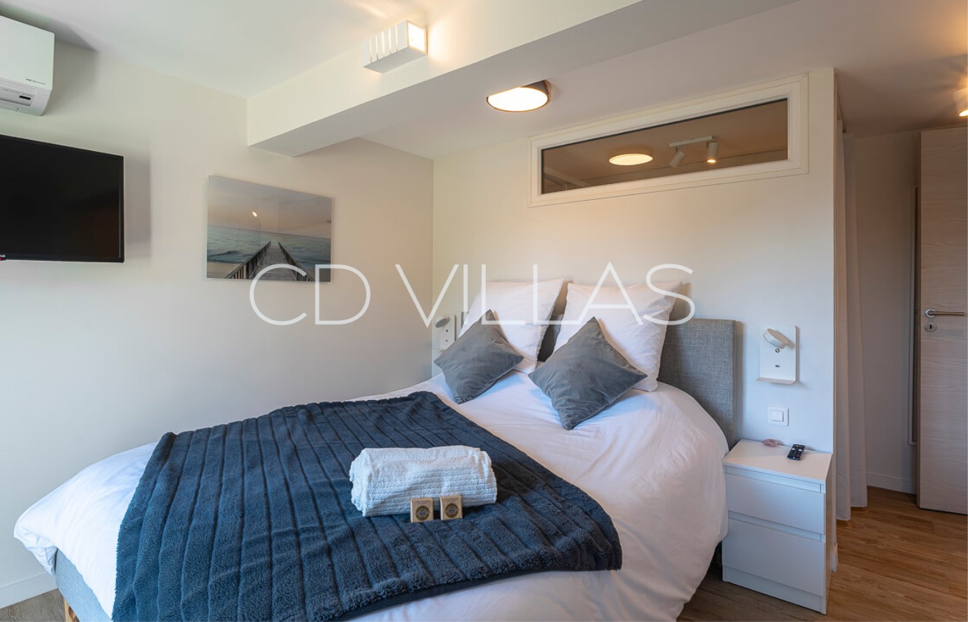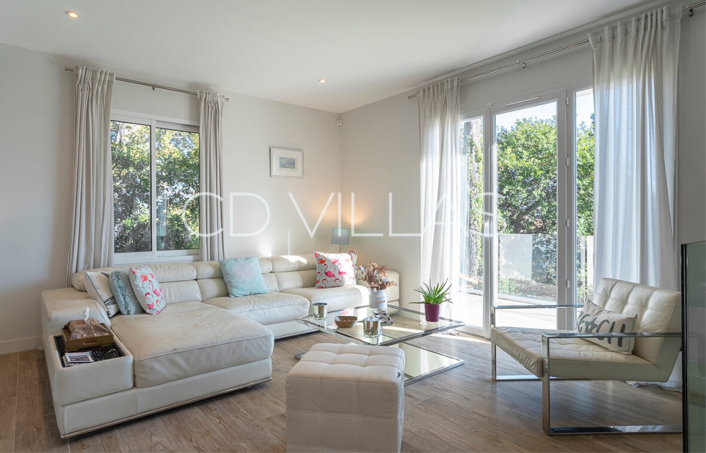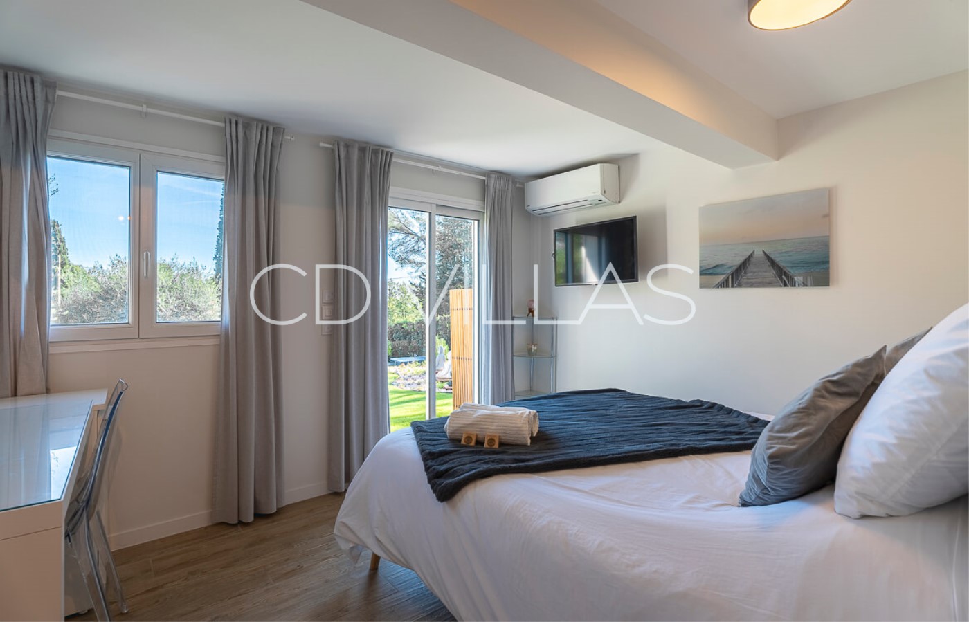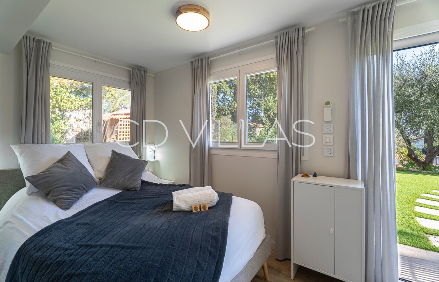 Das gesamte Haus ist mit Klimaanlage ausgestattet. Das Obergeschoss verfügt über eine offene Küche, ein Ess- und ein Wohnzimmer. Die voll ausgestattete moderne Küche öffnet sich zu einer großen Terrasse mit Blick auf den Garten und den Pool. Das Hauptschlafzimmer verfügt über ein großes eigenes Bad mit Sauna. Vom Schlafzimmer aus führen große Schiebetüren auf eine charmante und sehr private Terrasse mit Jacuzzi.