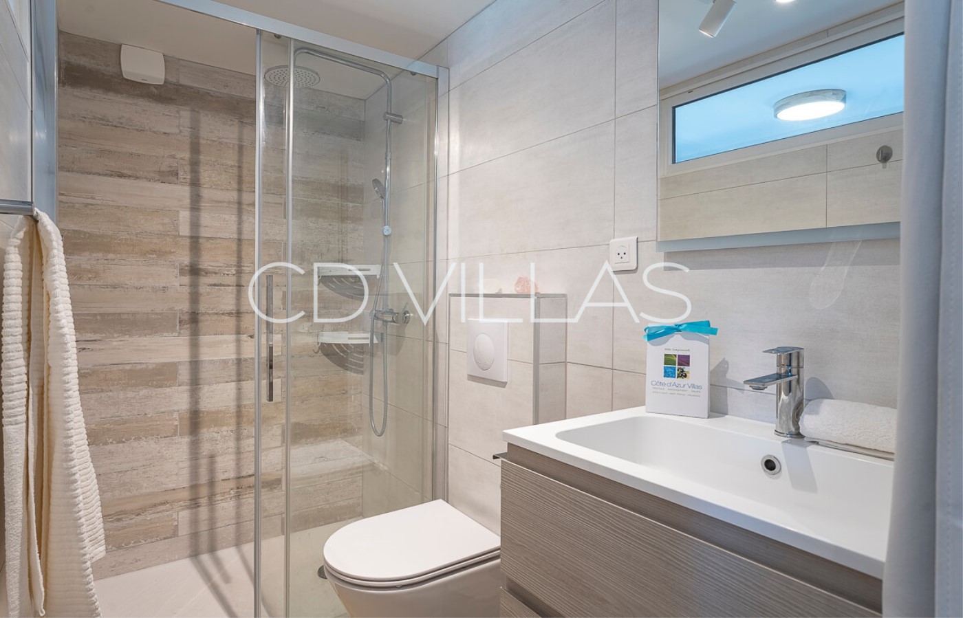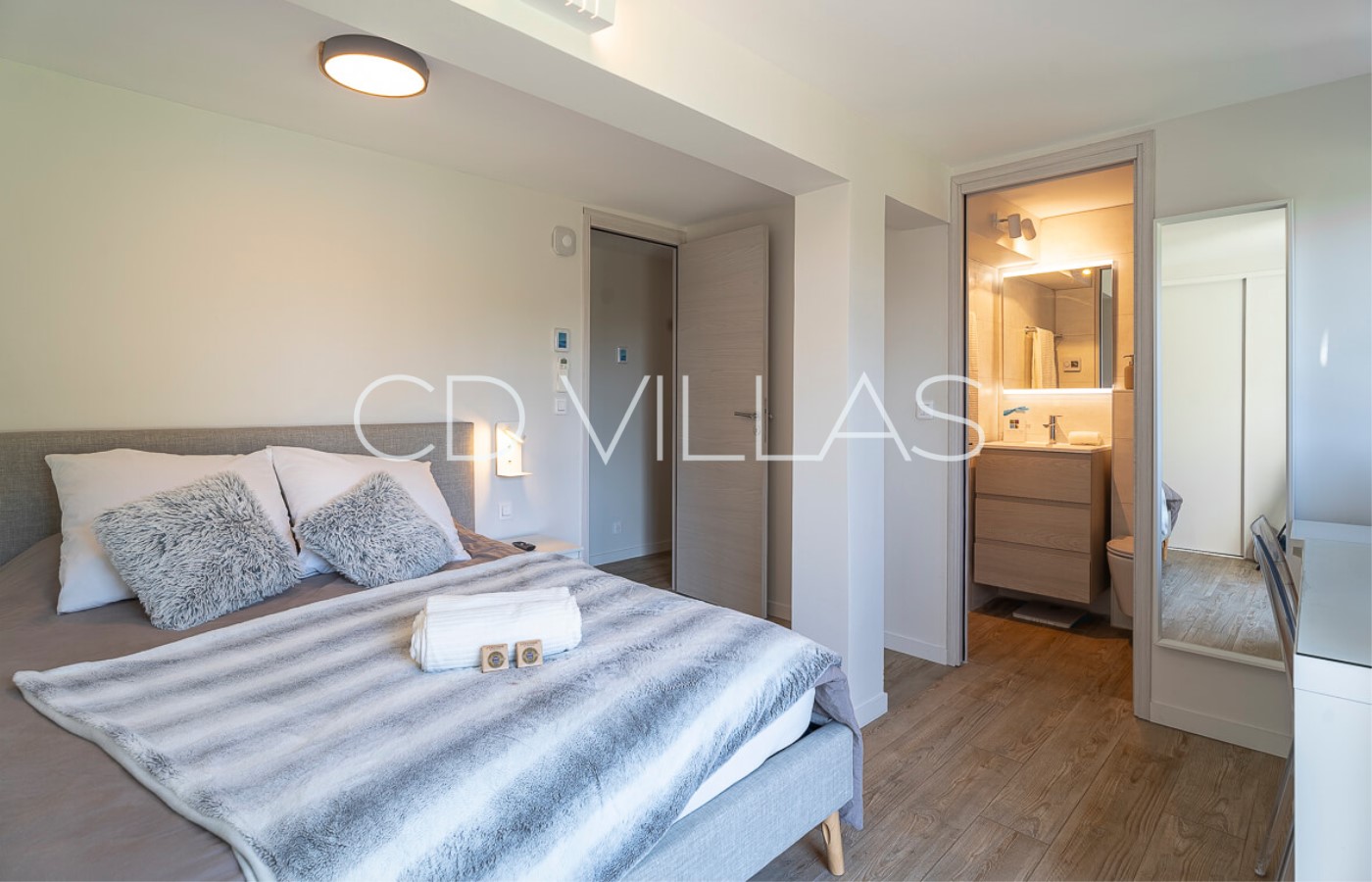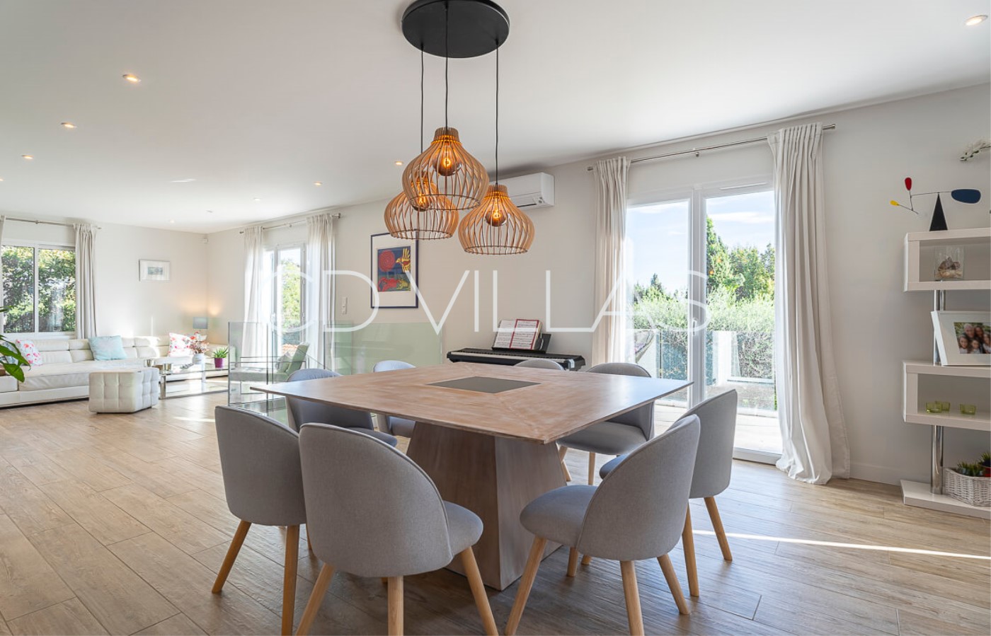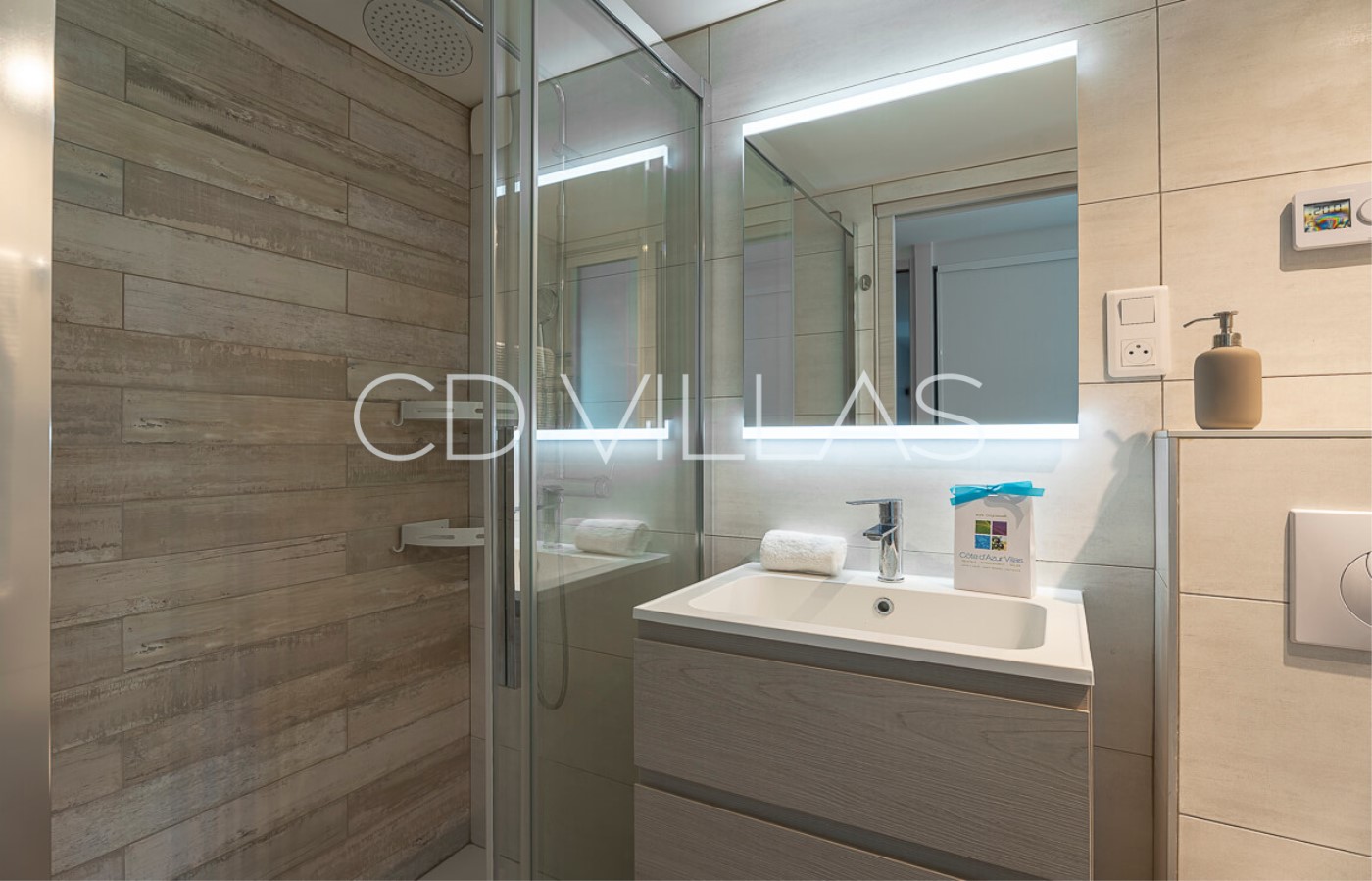 Das gesamte Haus ist mit Klimaanlage ausgestattet. Das Obergeschoss verfügt über eine offene Küche, ein Ess- und ein Wohnzimmer. Die voll ausgestattete moderne Küche öffnet sich zu einer großen Terrasse mit Blick auf den Garten und den Pool. Das Hauptschlafzimmer verfügt über ein großes eigenes Bad mit Sauna. Vom Schlafzimmer aus führen große Schiebetüren auf eine charmante und sehr private Terrasse mit Jacuzzi.