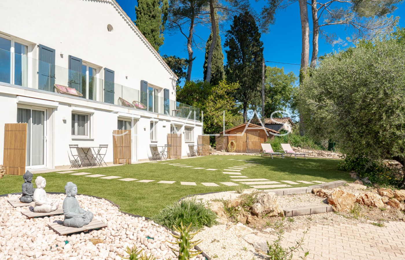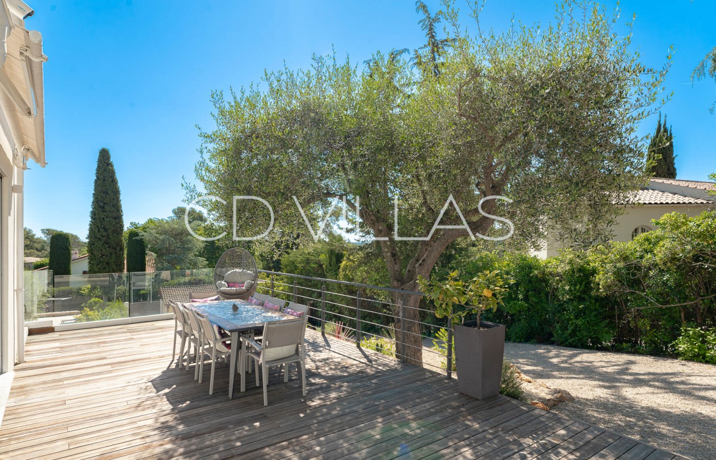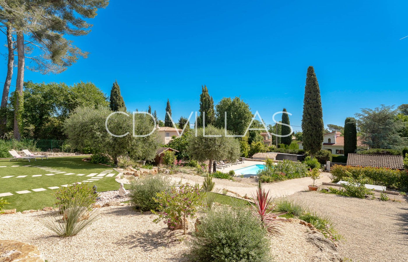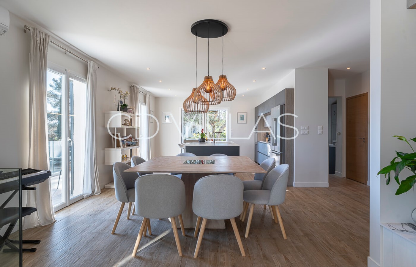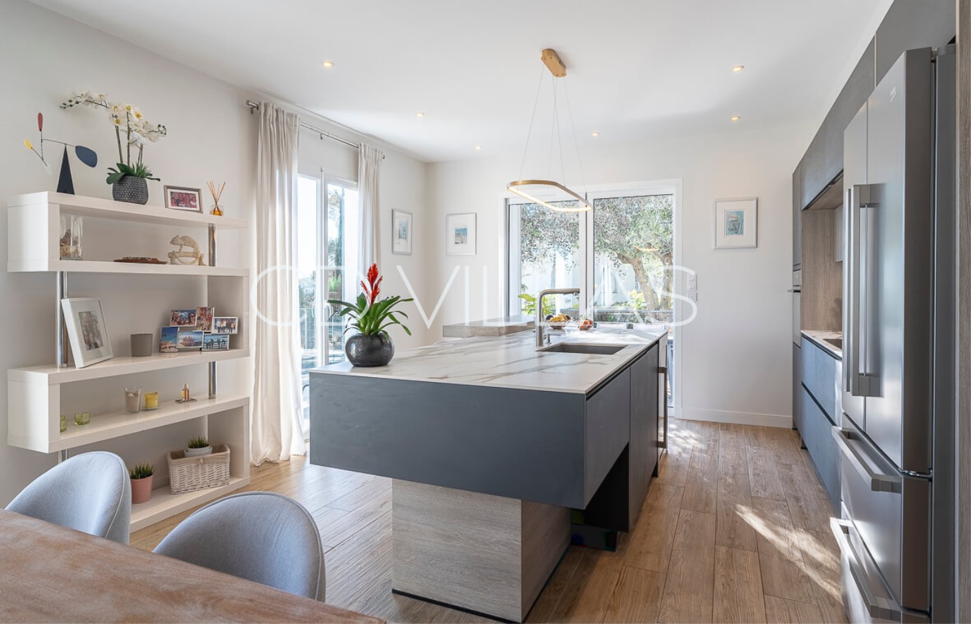 Das gesamte Haus ist mit Klimaanlage ausgestattet. Das Obergeschoss verfügt über eine offene Küche, ein Ess- und ein Wohnzimmer. Die voll ausgestattete moderne Küche öffnet sich zu einer großen Terrasse mit Blick auf den Garten und den Pool. Das Hauptschlafzimmer verfügt über ein großes eigenes Bad mit Sauna. Vom Schlafzimmer aus führen große Schiebetüren auf eine charmante und sehr private Terrasse mit Jacuzzi.