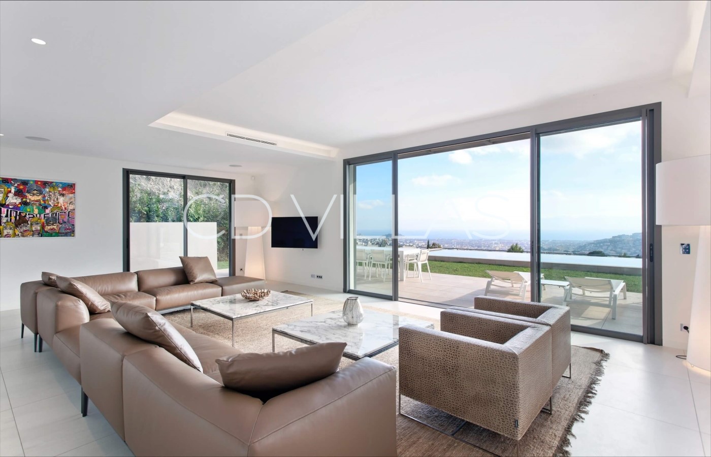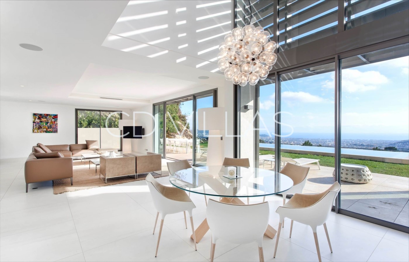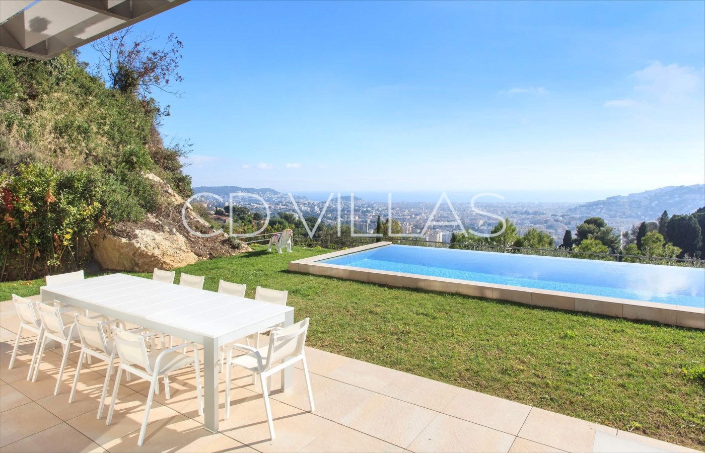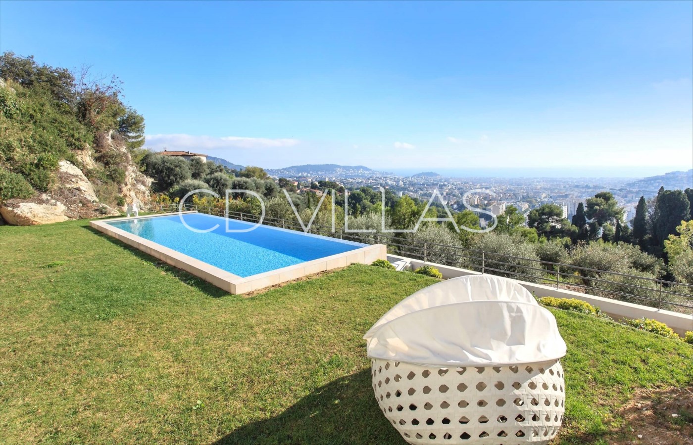 Diese atemberaubende moderne Villa, die von einem renommierten lokalen Architekten entworfen wurde, liegt auf einem markanten Hügel in einem prestigeträchtigen Anwesen in den Höhen von Nizza. Von den Terrassen der Villa und den meisten Innenräumen genießen die Gäste einen Panoramablick über die Stadt Nizza bis hin zum Mittelmeer. Der Infinity-Pool ist von wunderschön angelegten Gärten und flachen Rasenflächen umgeben, die ein wirklich einzigartiges und idyllisches Ambiente schaffen.