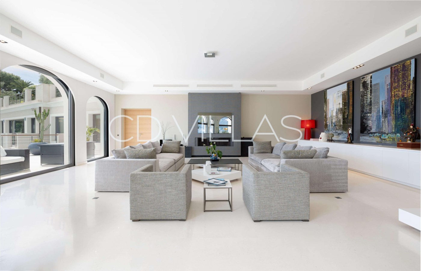 Sehr helles Wohnzimmer mit Blick auf den Hafen von Saint Jean Cap