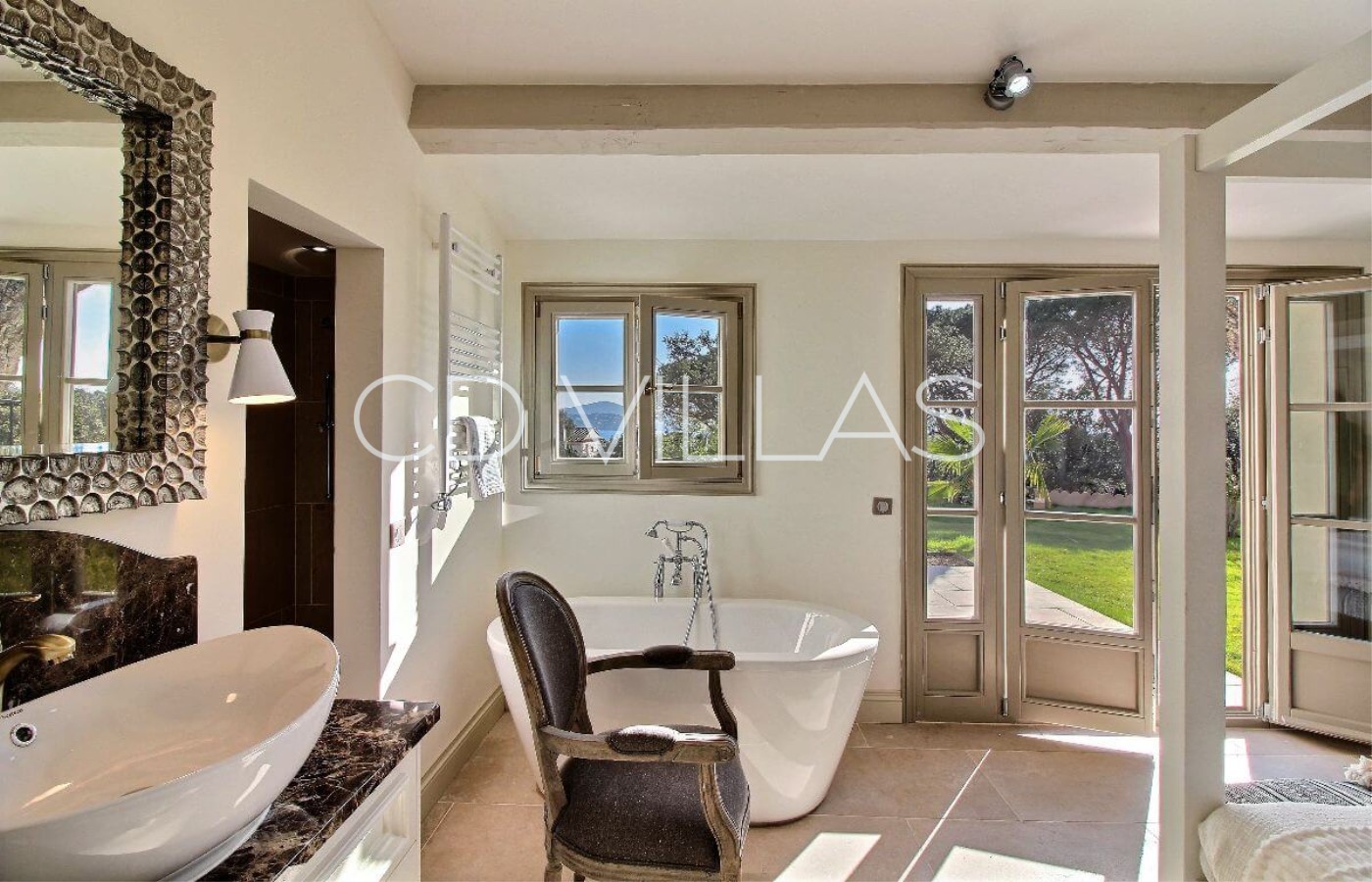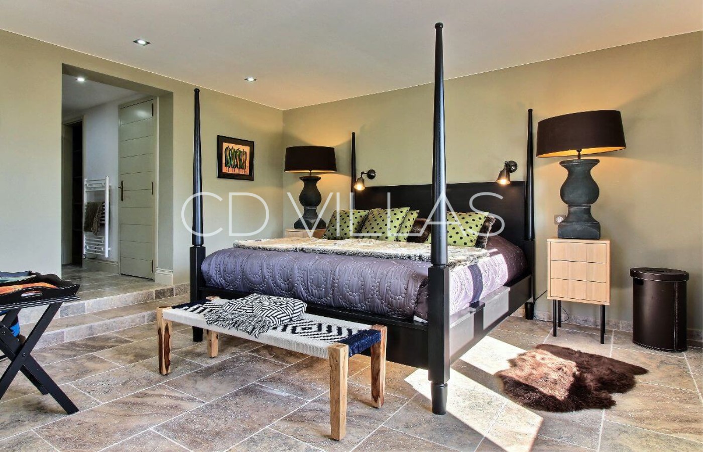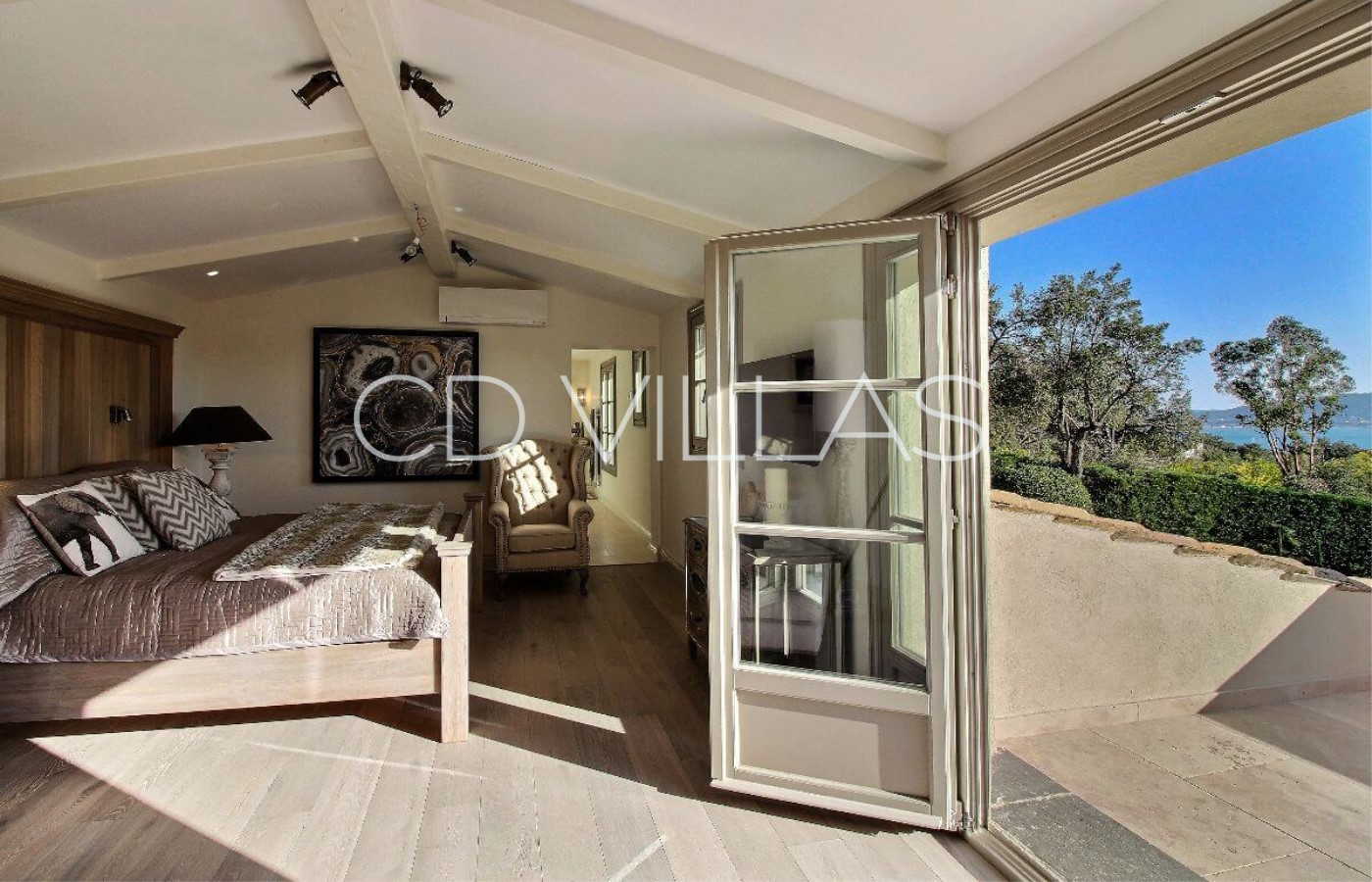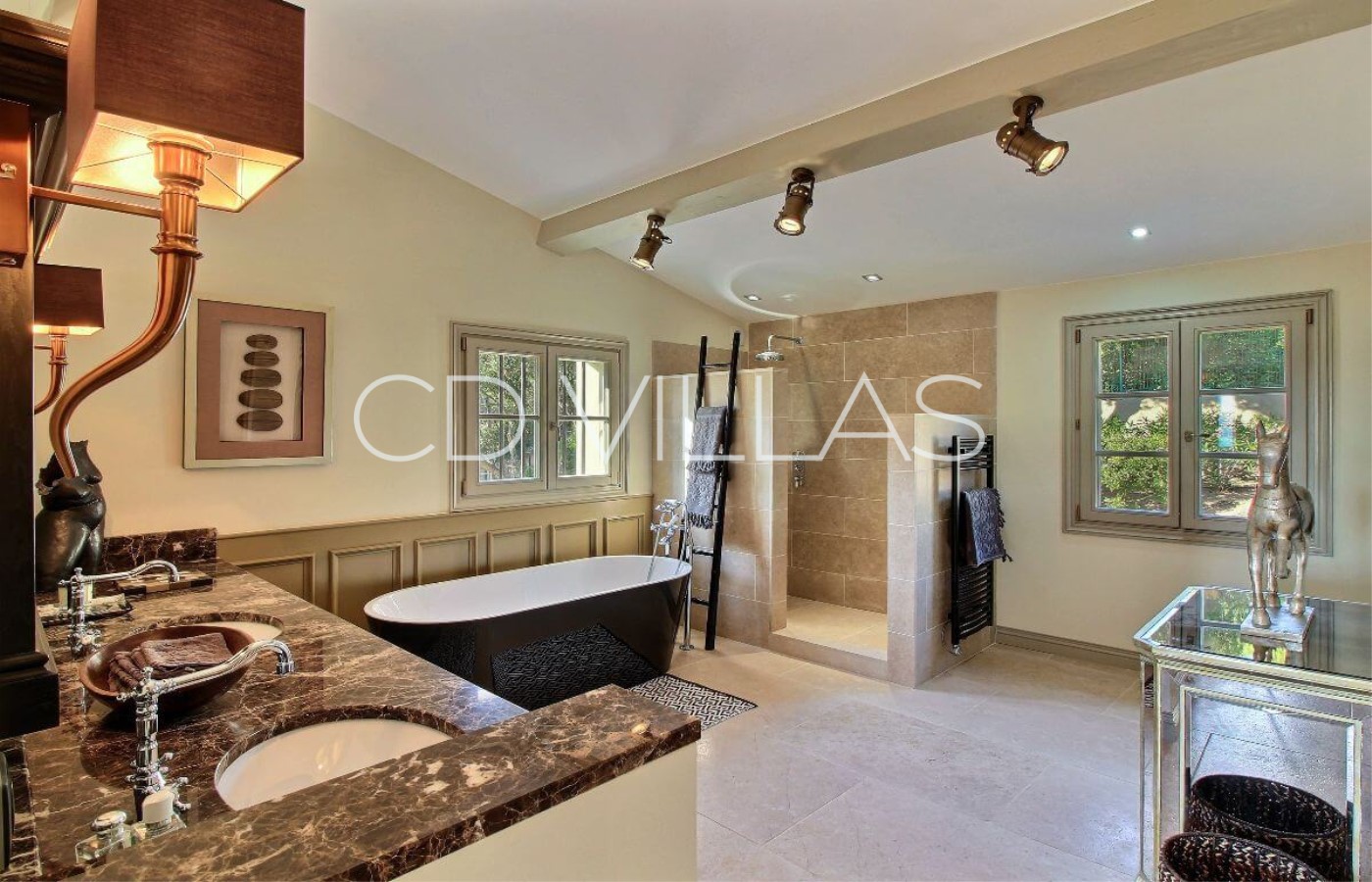 Die Villa bietet vier luxuriöse Schlafzimmer Suites, alle mit fabelhaften en suite Badezimmern. In den beiden oberen Etagen befinden sich zwei große Schlafzimmer Suites mit Doppelbett und privatem Balkon und herrlichem Meerblick. In der Gartenebene befinden sich zwei weitere en suite Schlafzimmer mit direktem Zugang zum Garten und Pool.