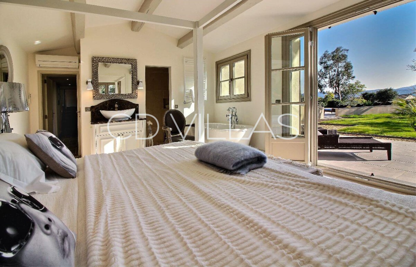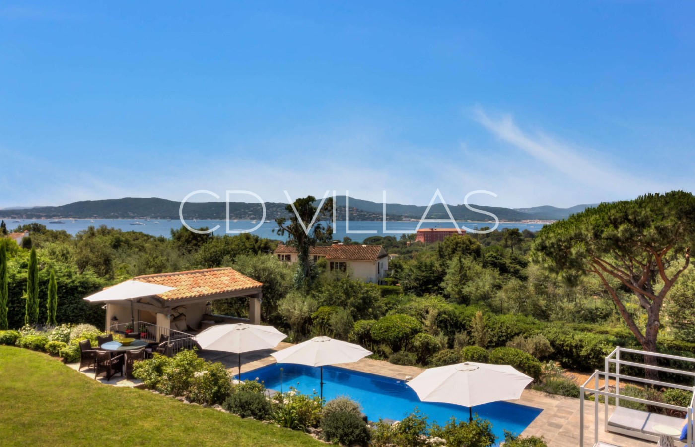 Eine einzigartige Designer Villa mit Blick auf die Bucht von St Tropez, nur einige Minuten zu Fuß zum Strand und eine kurze Fahrt zum lebhaften Cote d'Azur Städtchen Sainte Maxime, 15 Minuten mit dem Auto oder Fähre nach St Tropez. Die Villa hat vier luxuriöse Schlafzimmer Suites, komplett klimatisiert und hat einen beheizbaren Pool. Ein separates Gästehaus mit 3 Schlafzimmern kann zusätzlich angemietet werden für bis zu 14 Personen.